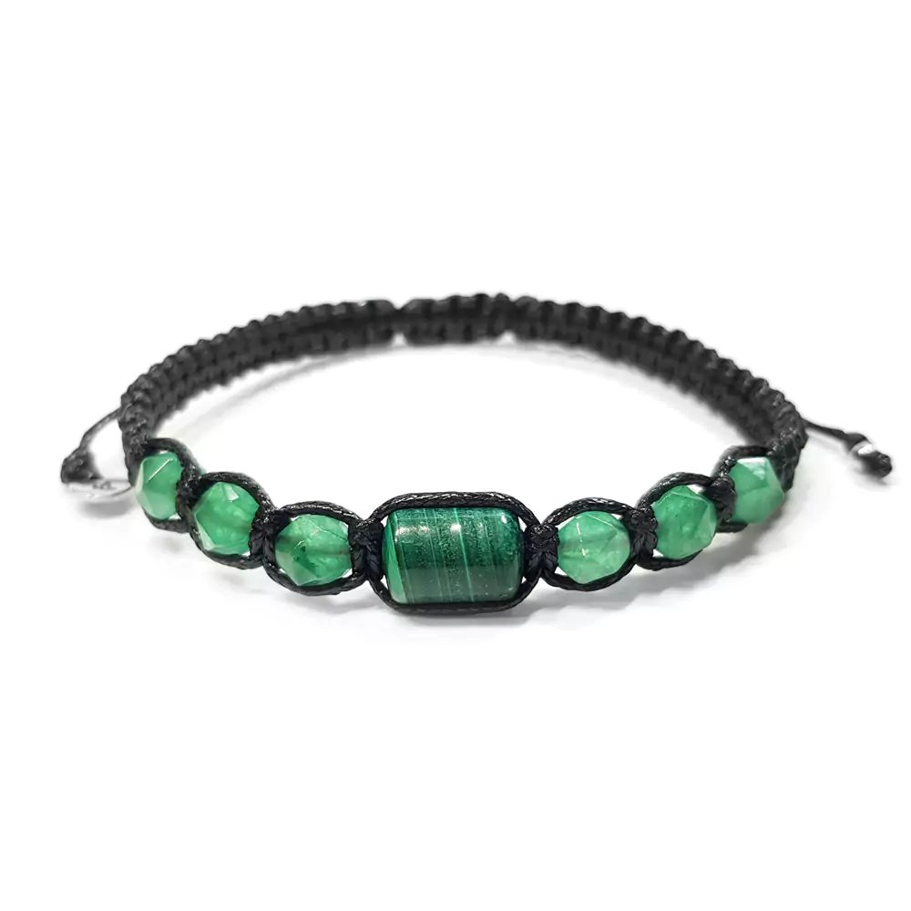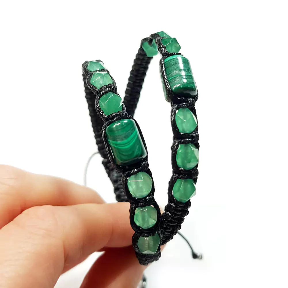 Bransoletka została wykonana z wałeczka malachitu i bryłek agatu zielonego. Podstawę stanowi mocny, nylonowy sznurek.
