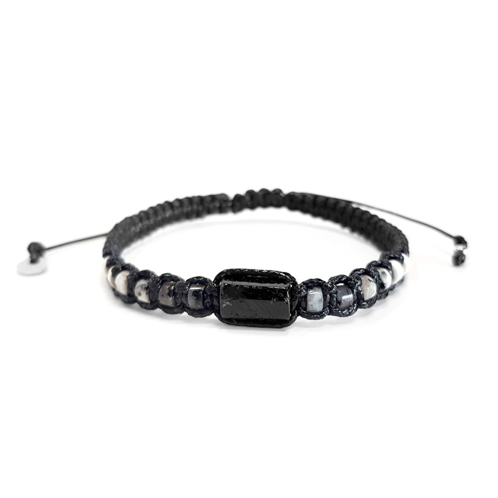 Bransoletka została wykonana z bryłki czarnego turmalinu oraz talarków larvikitu, jaspisu lotus i howlitu. Podstawę stanowi mocny, nylonowy sznurek.