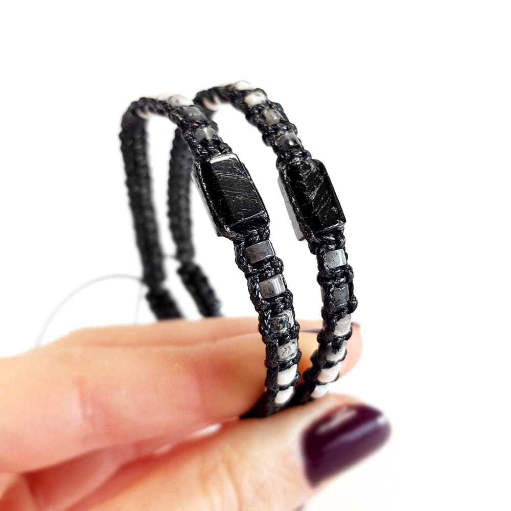 Męska bransoletka makramowa czarny turmalin, larvikit, jaspis lotus i howlit