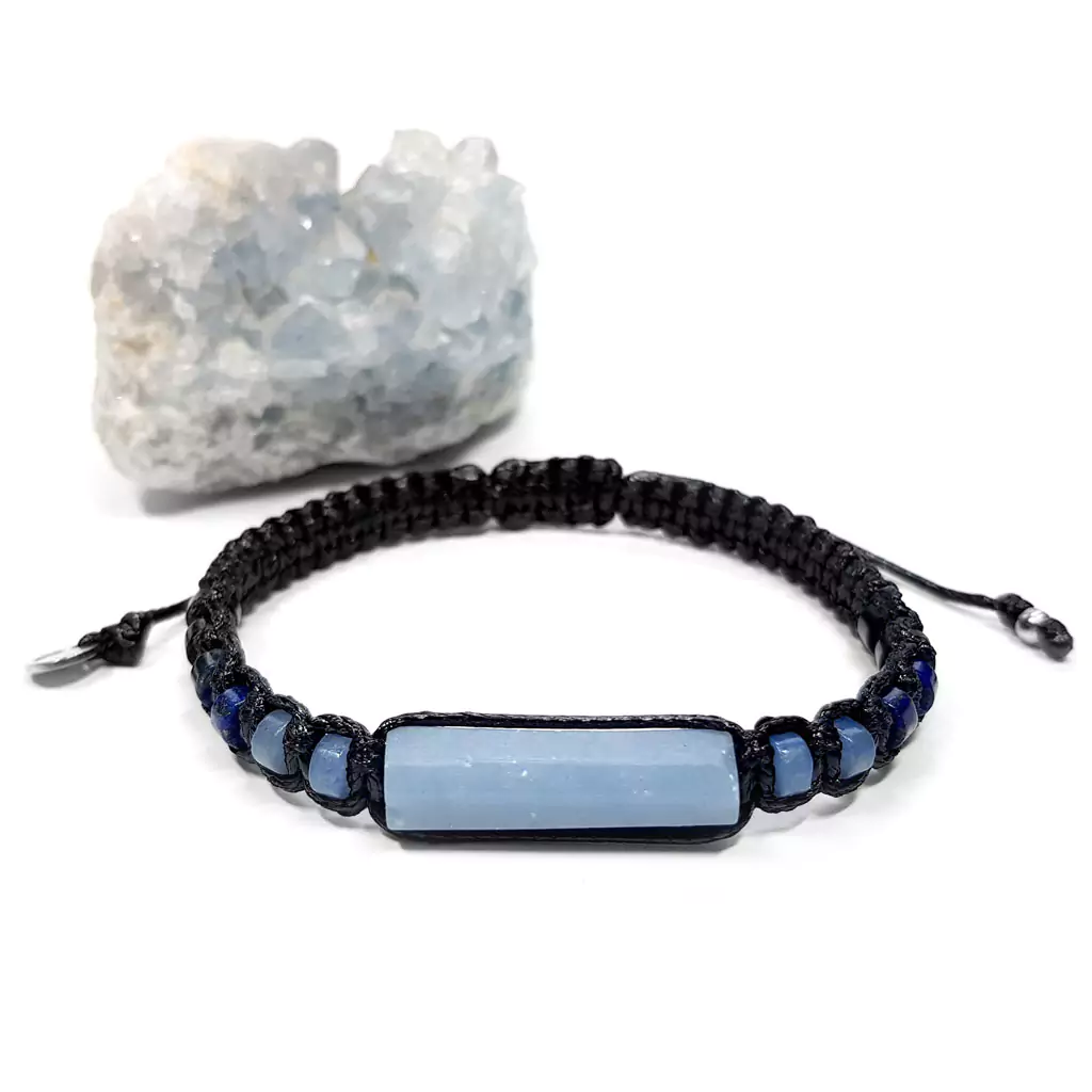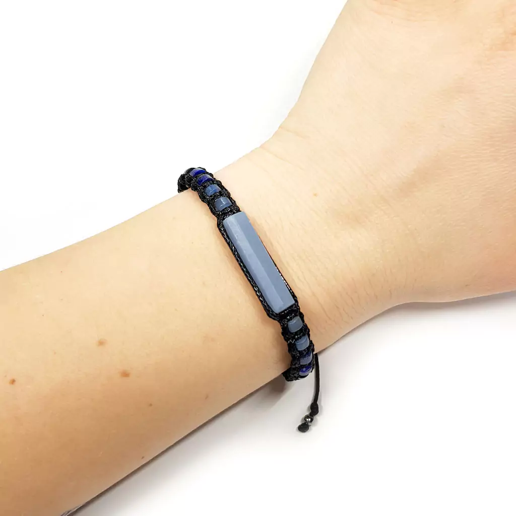 Bransoletka została wykonana ze słupka angelitu i talarków awenturynu niebieskiego, lapisu lazuli i onyksu. Podstawę stanowi mocny, nylonowy sznurek.