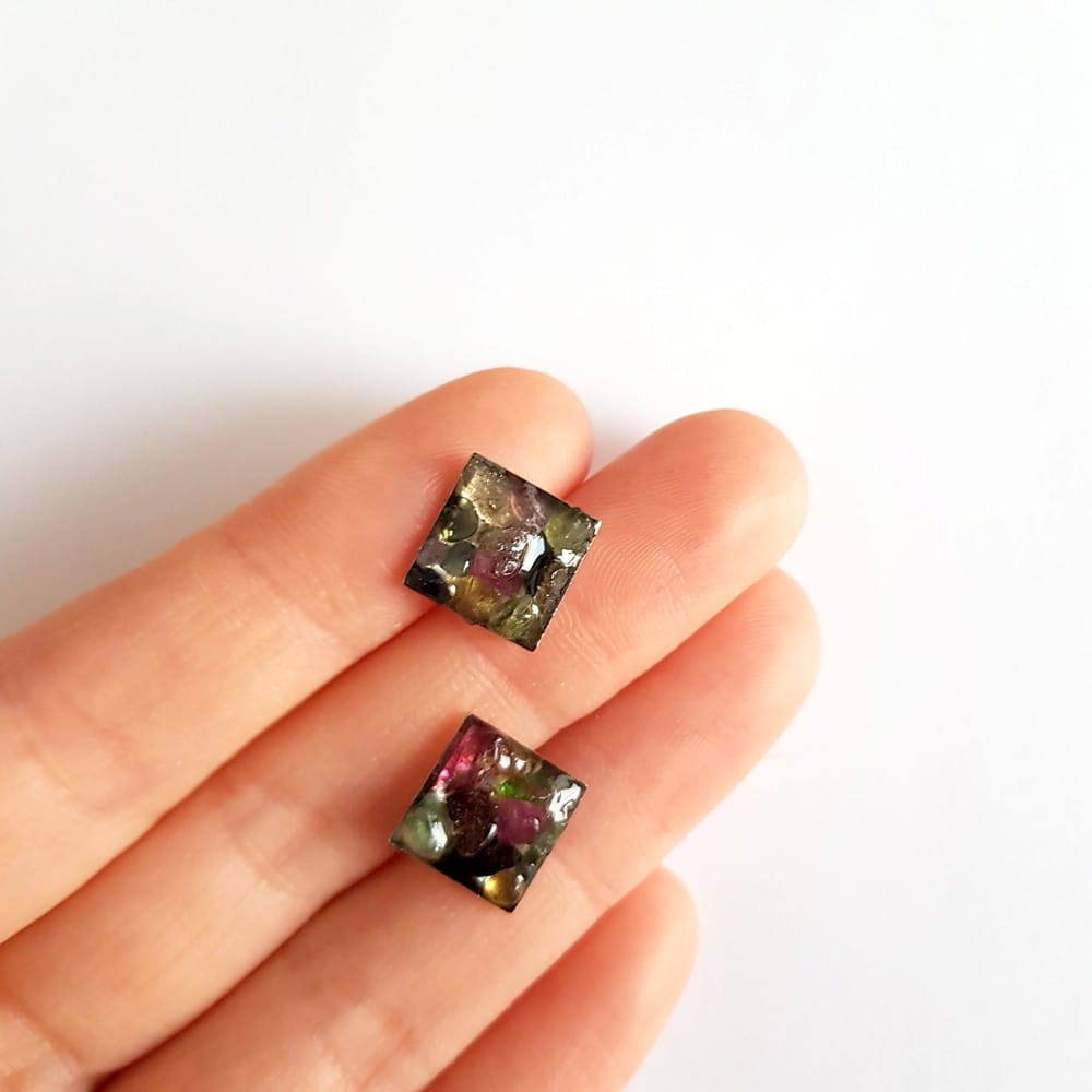 Kolczyki wykonane ręcznie z metalowych baz ze stali chirurgicznej w kształcie kwadratów oraz drobnych bryłek kolorowych turmalinów zatopionych w żywicy jubilerskiej.
