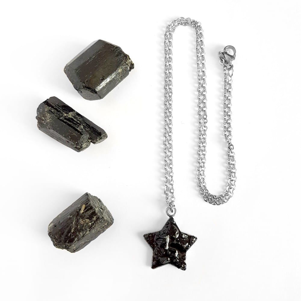 Naszyjnik wykonany z bryłek czarnego turmalinu zatopionych w żywicy jubilerskiej oraz elementów metalowych ze stali chirurgicznej.