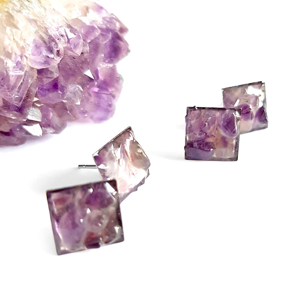 Kolczyki wykonane ręcznie z metalowych baz ze stali chirurgicznej w kształcie kwadratów oraz drobnych bryłek ametystu zatopionych w żywicy jubilerskiej.