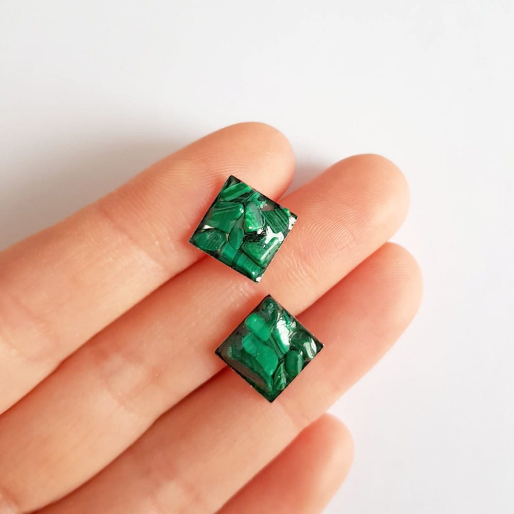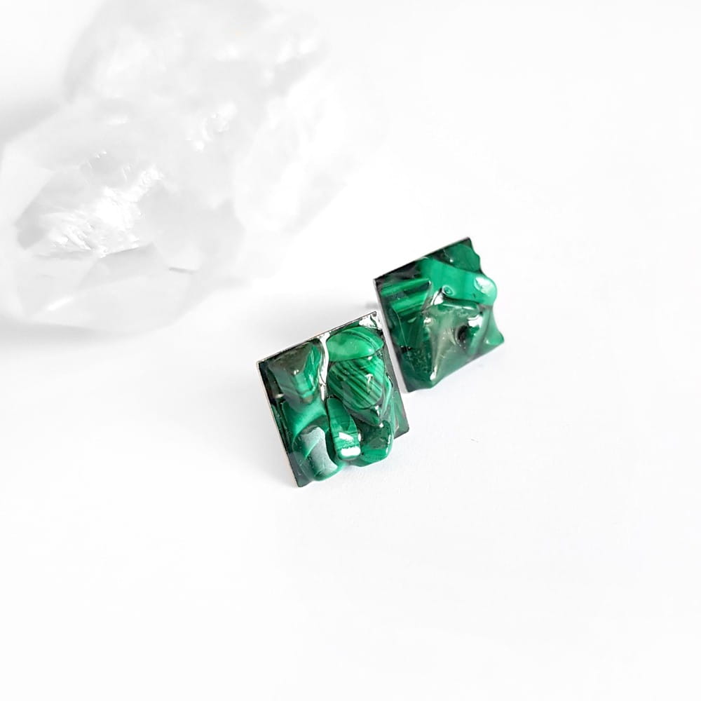 Kolczyki wykonane ręcznie z metalowych baz ze stali chirurgicznej w kształcie kwadratów oraz drobnych bryłek naturalnego malachitu zatopionych w żywicy jubilerskiej.