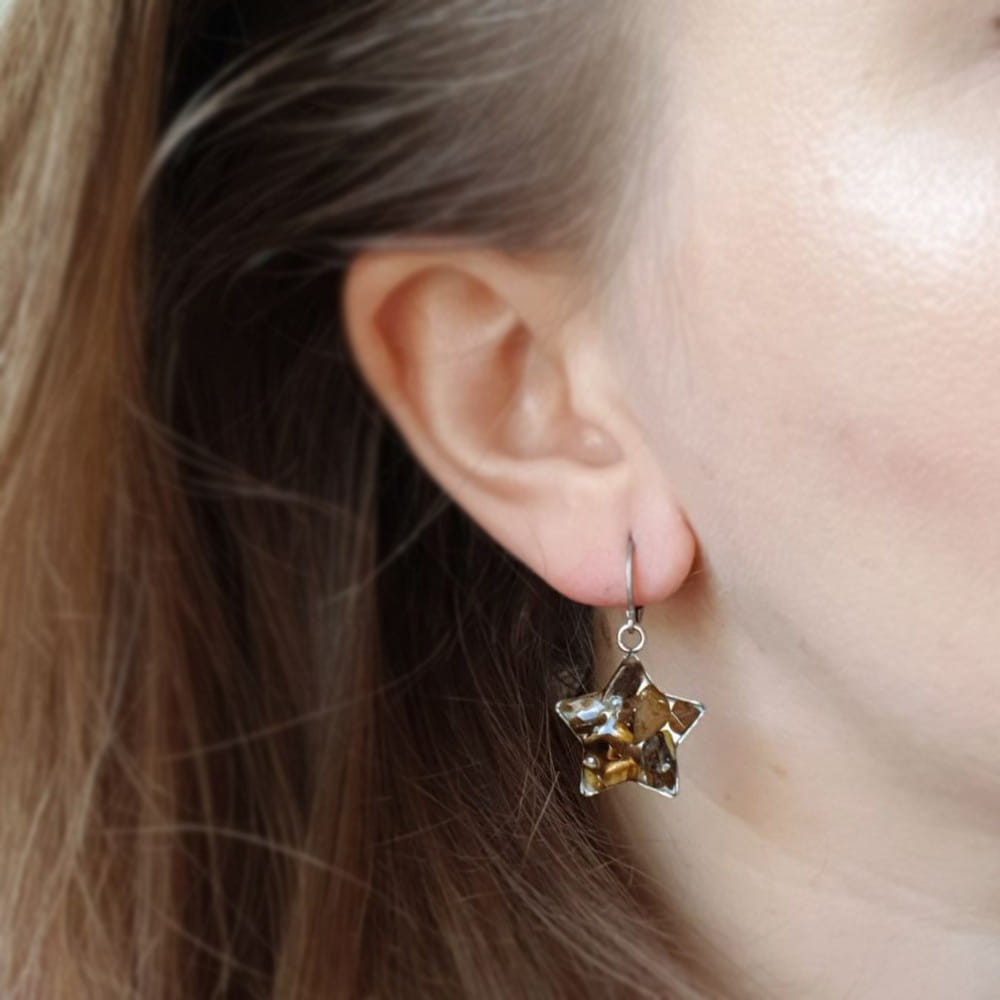 Kolczyki wiszące gwiazdki tygrysie oko w żywicy stal chirurgiczna Sparkles brown