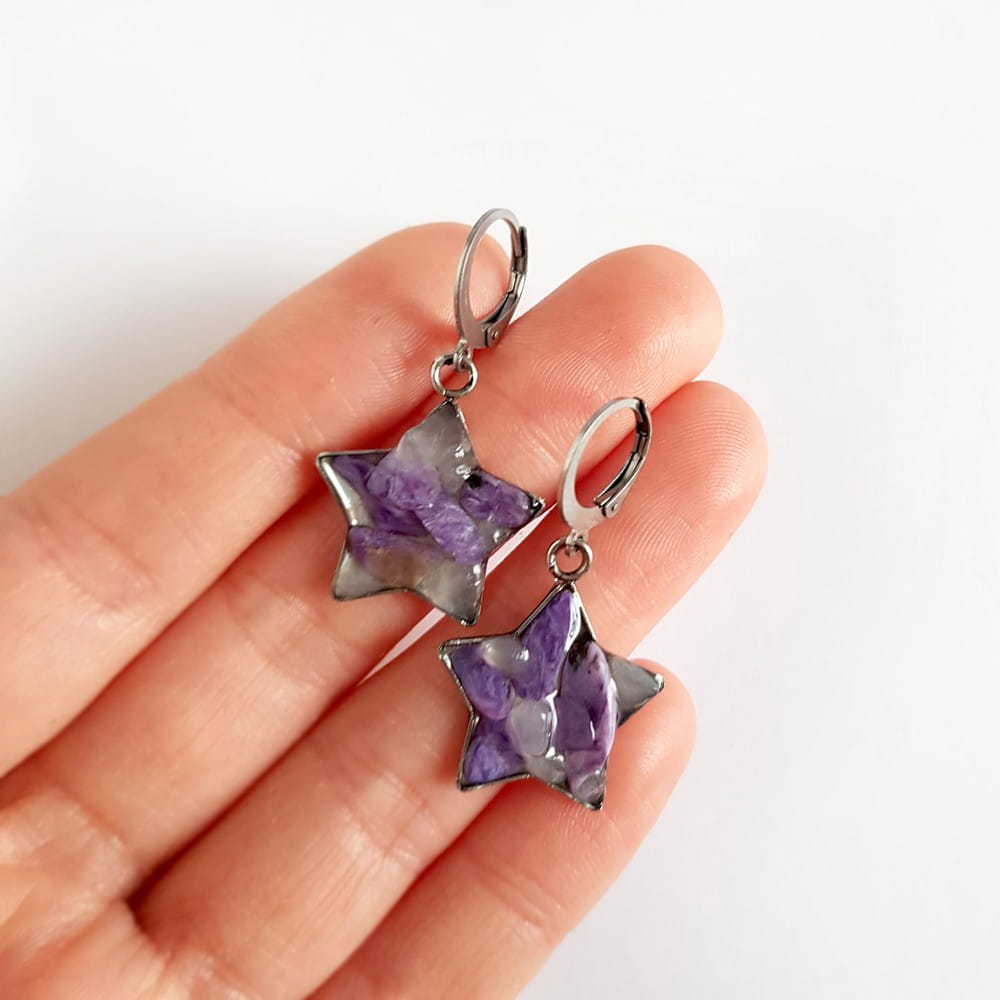 Kolczyki wiszące gwiazdki czaroit w żywicy stal chirurgiczna Sparkles purple