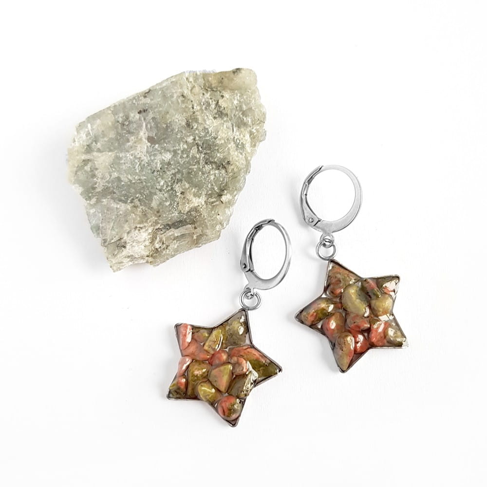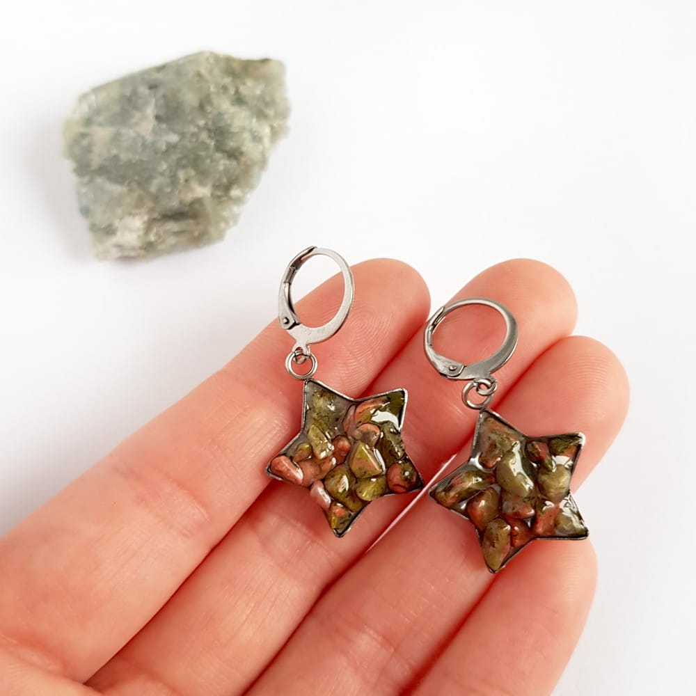 Kolczyki wiszące gwiazdki unakit w żywicy stal chirurgiczna Sparkles unakite