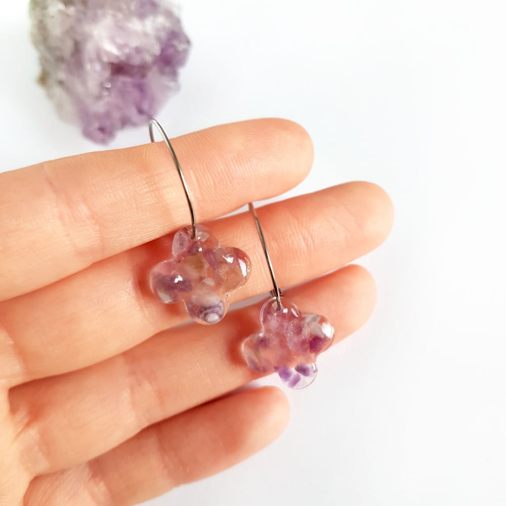 Kolczyki wykonane z drobnych bryłek ametystu zatopionych w żywicy oraz kółeczek ze stali chirurgicznej.