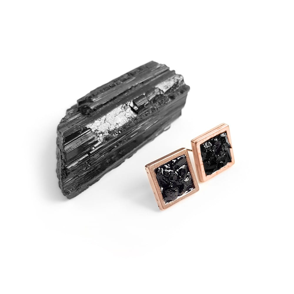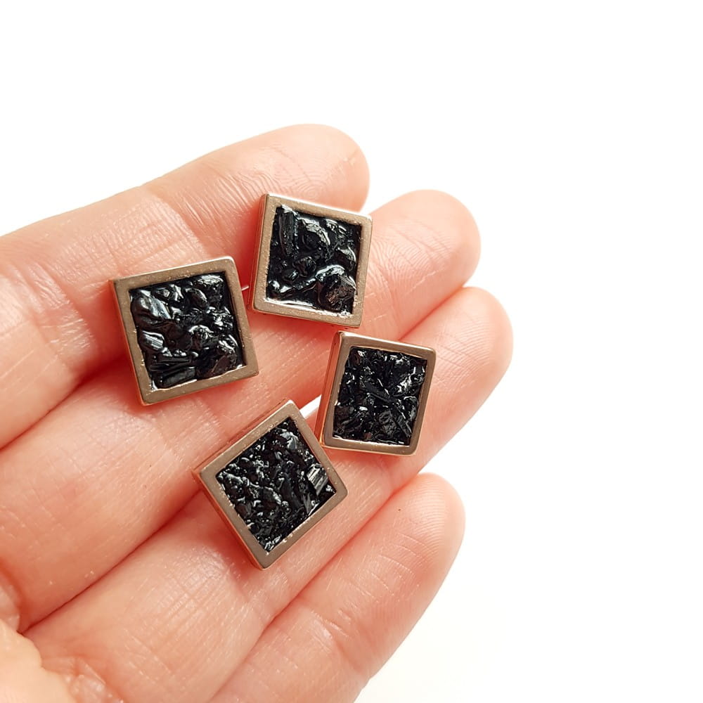 Kolczyki wykonane ręcznie z metalowych baz ze stali chirurgicznej w kształcie kwadratów w kolorze różowego złota oraz drobnych bryłek czarnego turmalinu zatopionych w żywicy jubilerskiej.