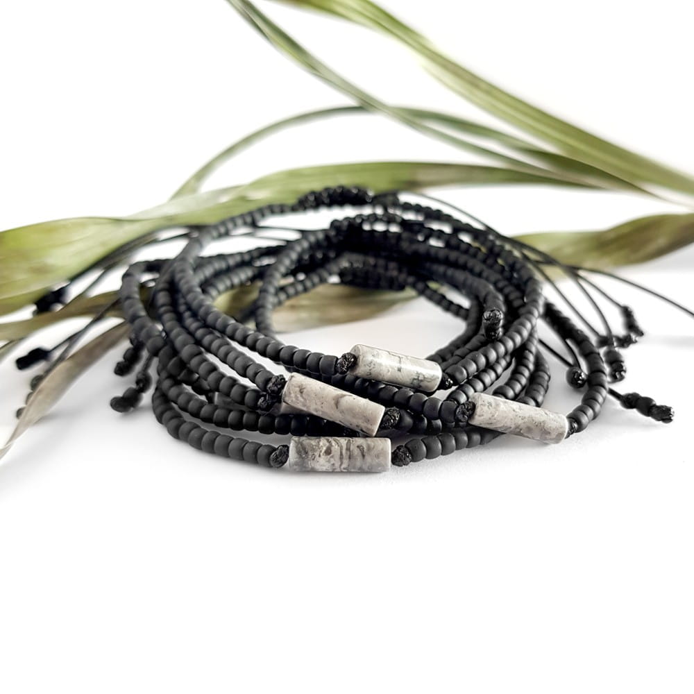 Bransoletka została wykonana z patyczka szarego jaspisu picasso. Podstawę stanowią matowe, szklane koraliki i mocny, nylonowy sznurek.