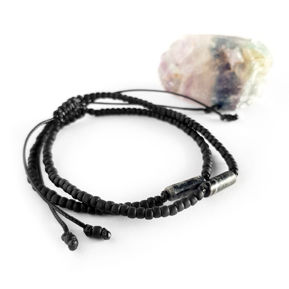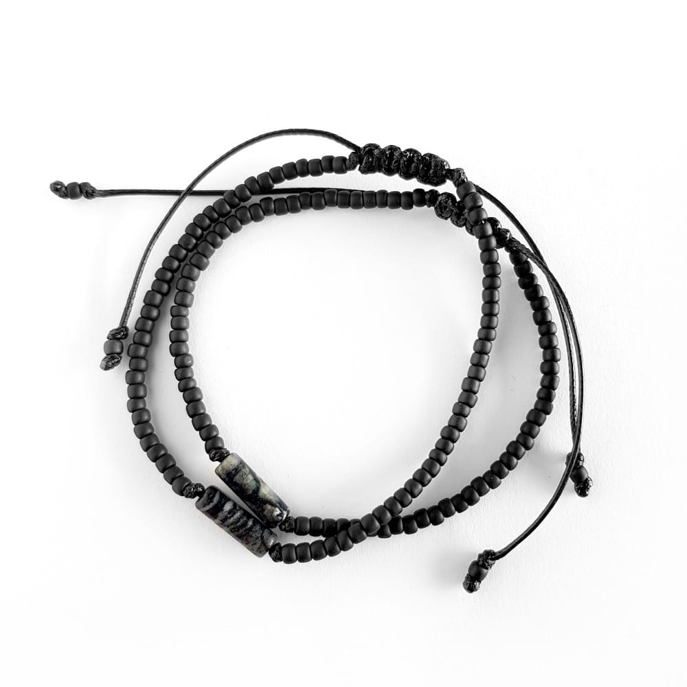 Bransoletka została wykonana z patyczka szarego jaspisu. Podstawę stanowią matowe, szklane koraliki i mocny, nylonowy sznurek.