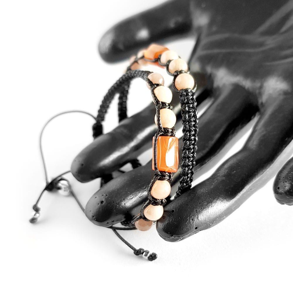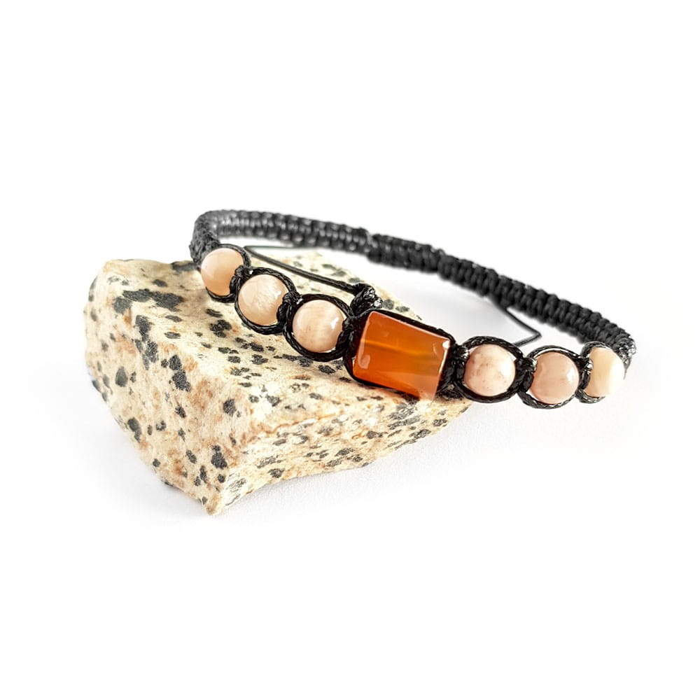 Bransoletka została wykonana z bryłki karneolu i kuleczek kamienia słonecznego. Podstawę stanowi mocny, nylonowy sznurek.
