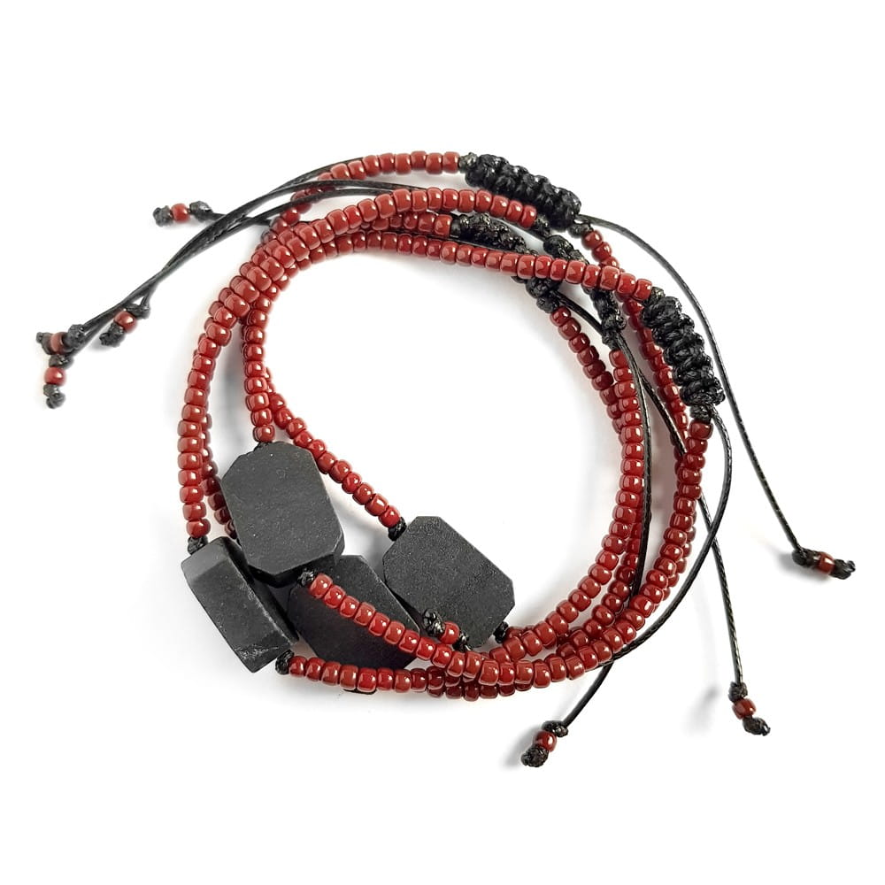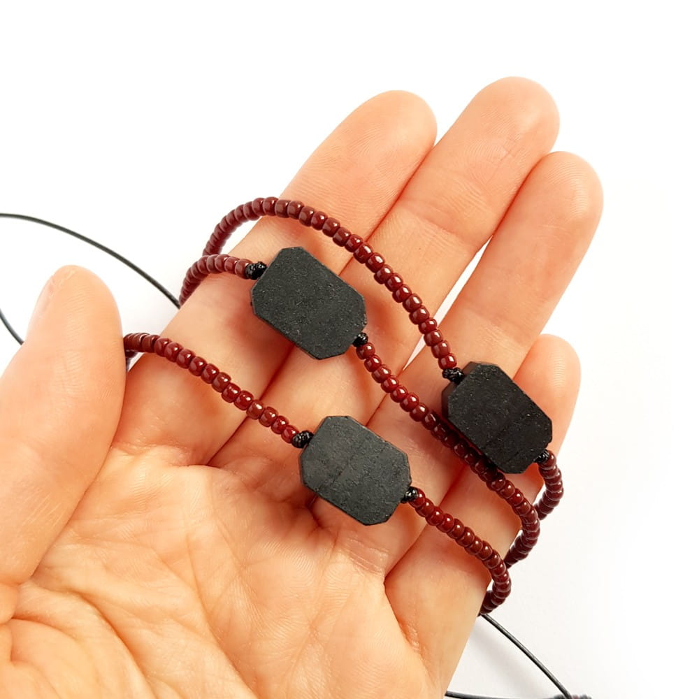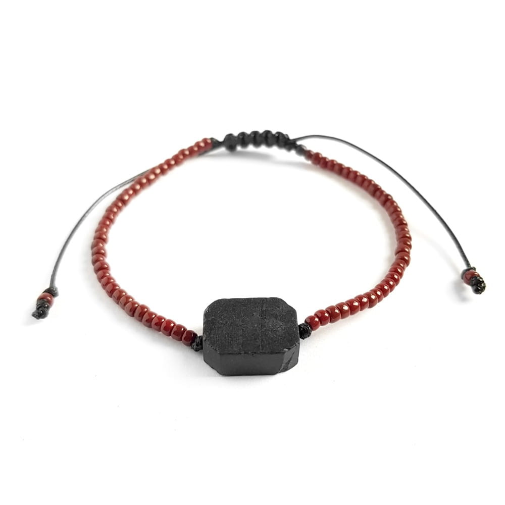 Bransoletka została wykonana z płytki czarnego turmalinu. Podstawę stanowią błyszczące, szklane koraliki i mocny, nylonowy sznurek.