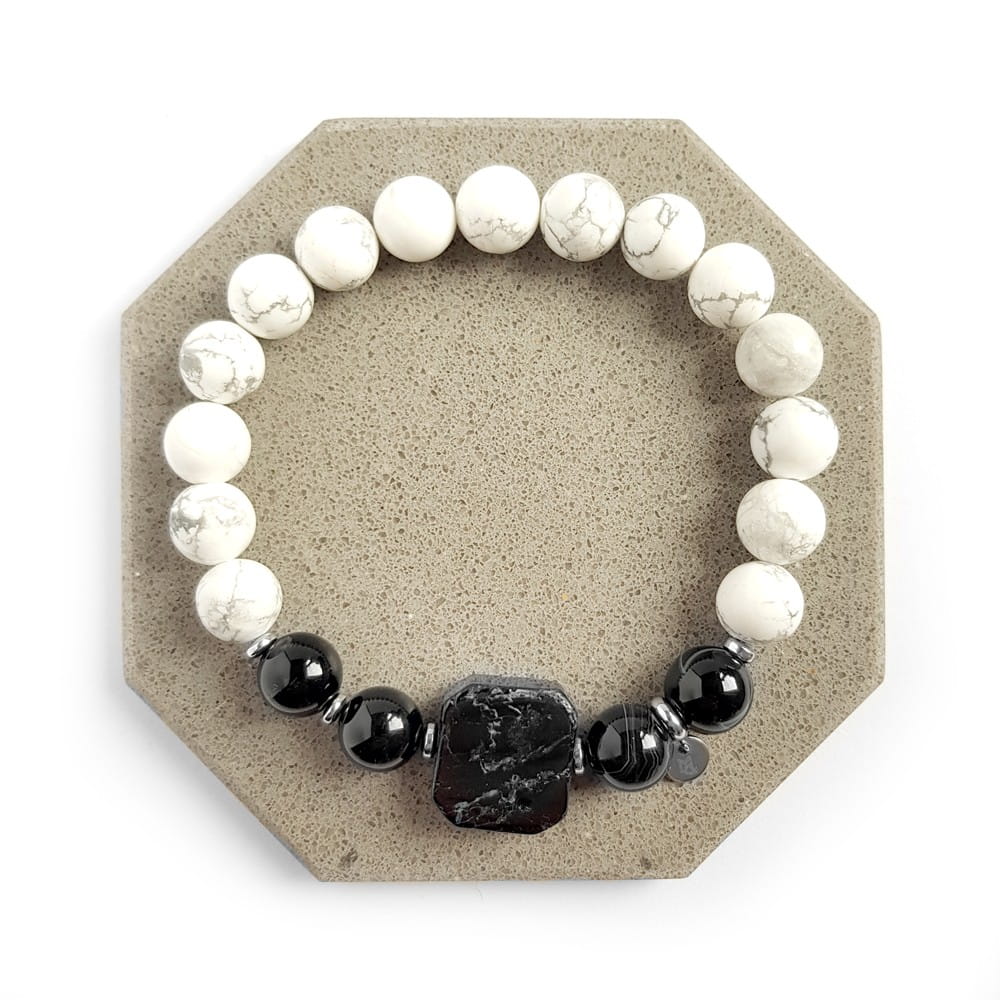 Bransoletka wykonana z kamieni naturalnych, mocnej gumki i elementów metalowych ze stali chirurgicznej. W bransoletce znajdziesz czarny turmalin, czarny agat pasiasty, howlit i hematyt