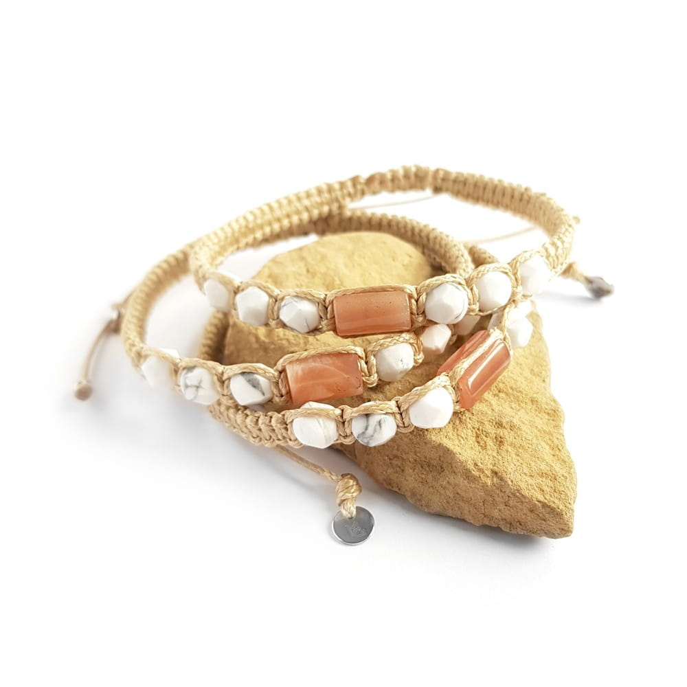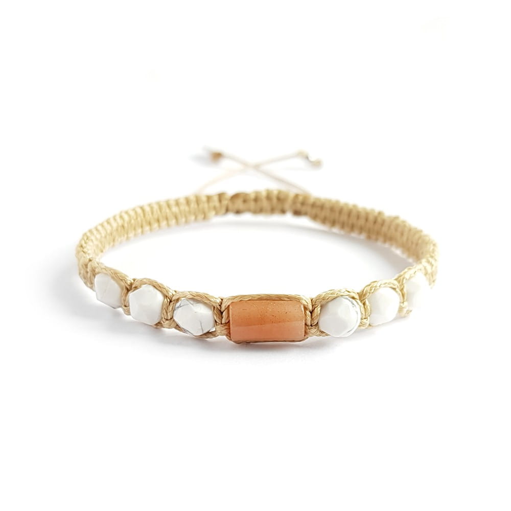 Bransoletka została wykonana z bryłki kamienia słonecznego oraz fasetowanych kuleczek howlitu. Podstawę stanowi mocny sznurek.