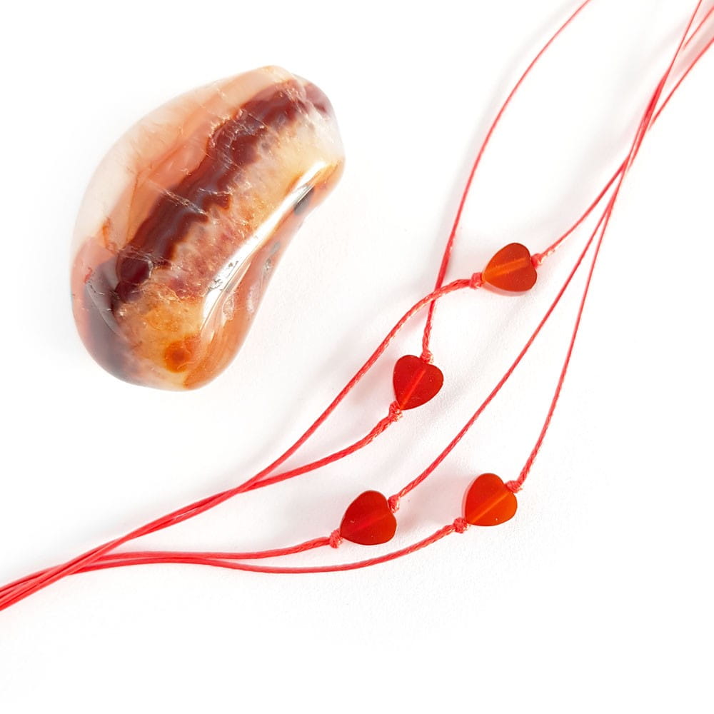 Biżuteria wykonana z nylonowego sznureczka, szklanych koralików oraz serduszka kamienia naturalnego - karneolu