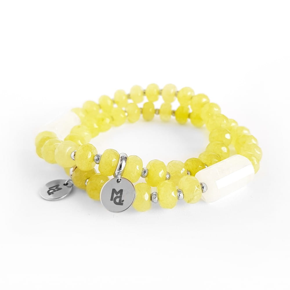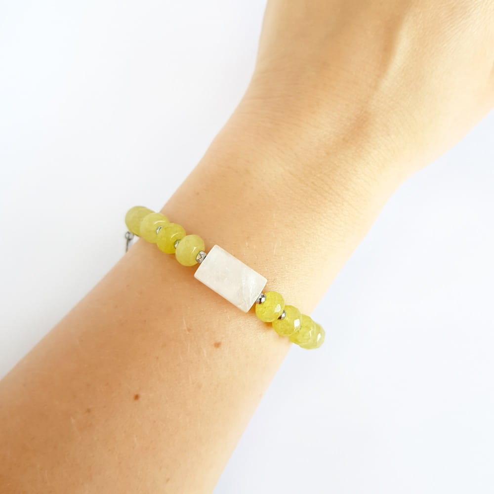 Bransoletka wykonana z dużego wałeczka fasetowanego kryształu górskiego, 8 mm oponek zielonego jadeitu oraz drobnych hematytów. Bazą bransoletki jest mocna, silikonowa gumka. Dodatek stanowi grawerowana blaszka z logo Magneska.