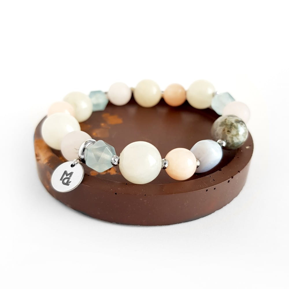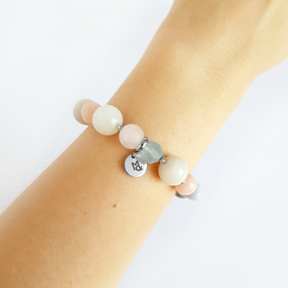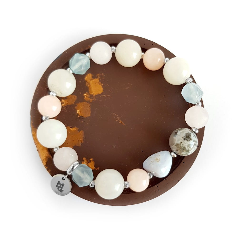 Bransoletka wykonana z miksu kamieni. W bransoletce znajdziesz: kwarc różowy, jadeit, marmurek, agat mszysty, niebieski agat i hematyt. Bazą bransoletki jest mocna, silikonowa gumka. Dodatek stanowi blaszka z logo Magneska.