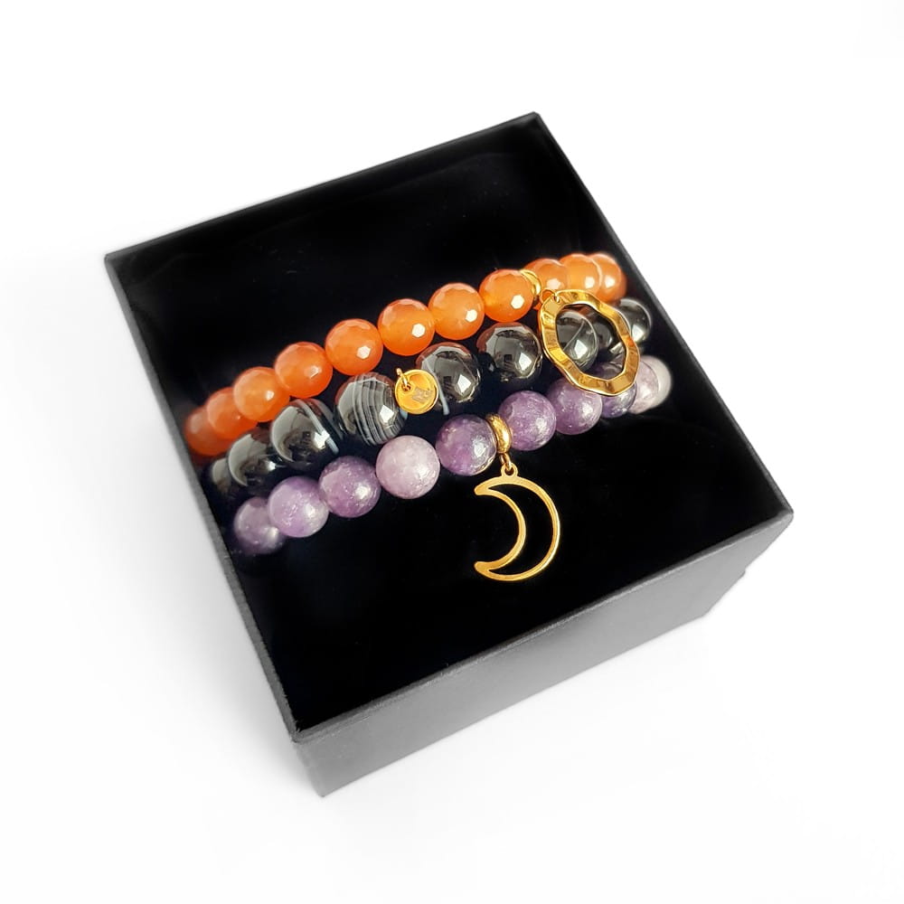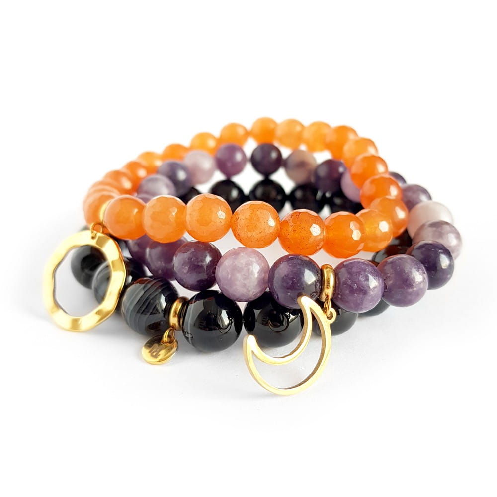 Zestaw bransoletek jadeit, czarny agat pasiasty i sugilit Autumn berries