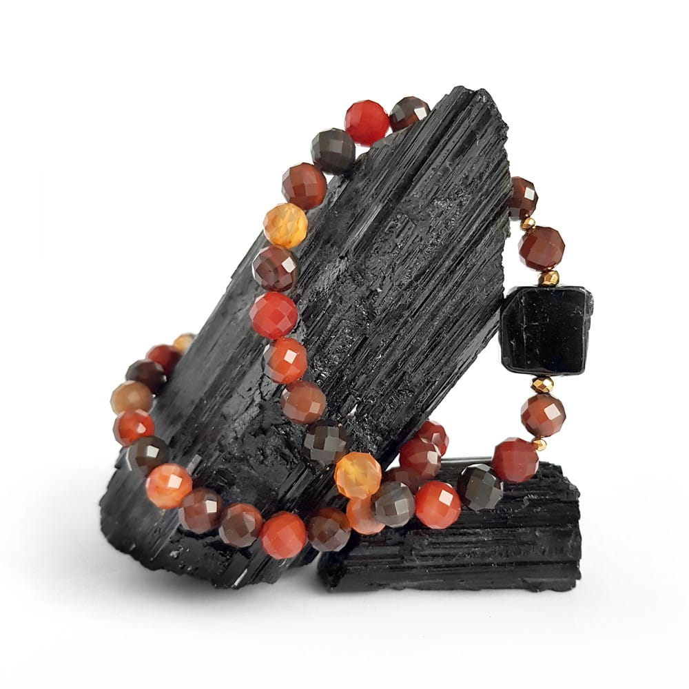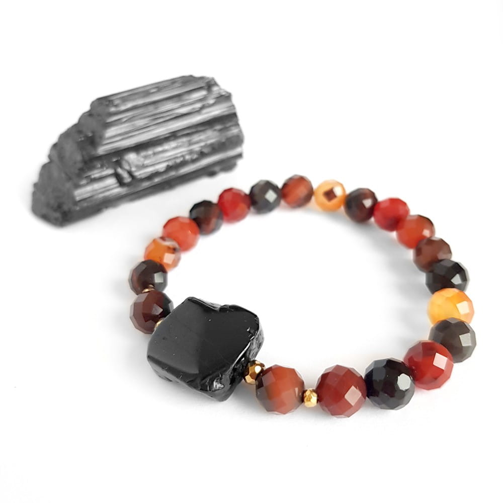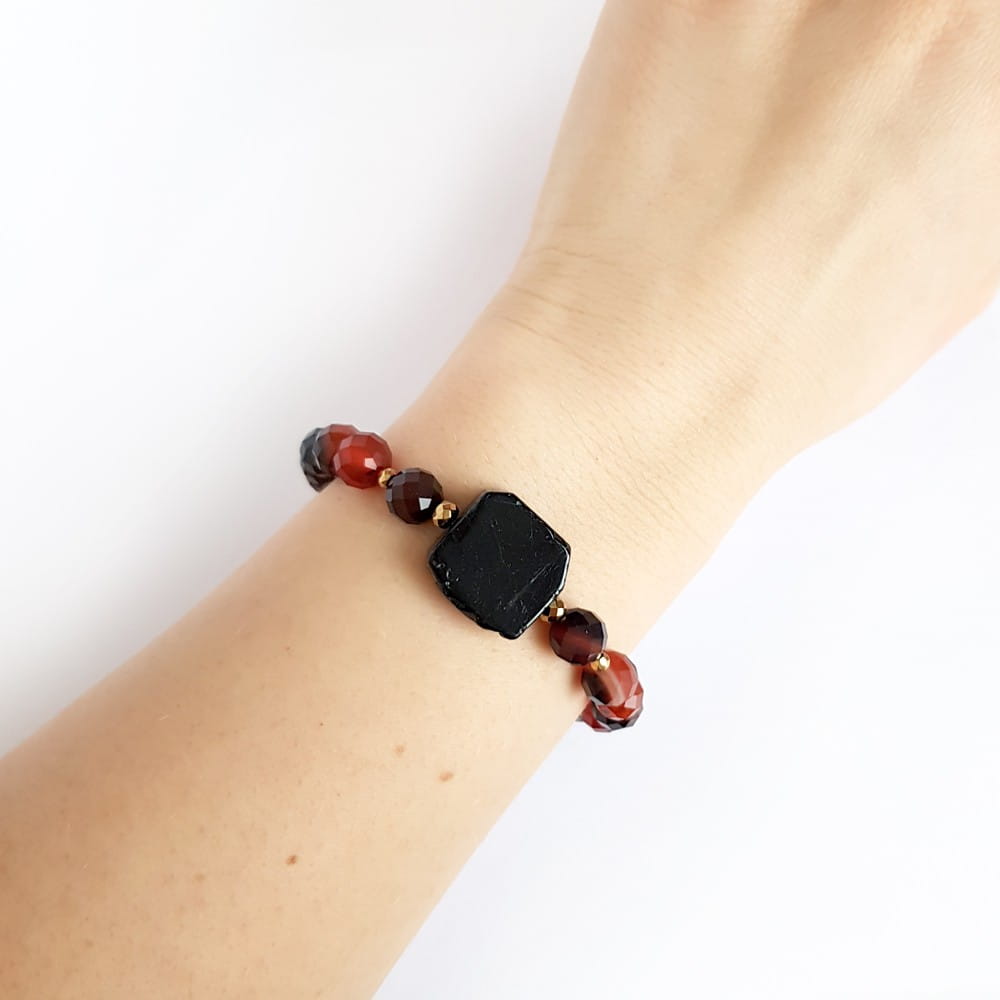 Bransoletka wykonana z dużej, fasetowanej płytki czarnego turmalinu, 8 mm kuleczek pomarańczowego agatu pasiastego oraz przekładek z hematytu. Bazą bransoletki jest mocna, silikonowa gumka.