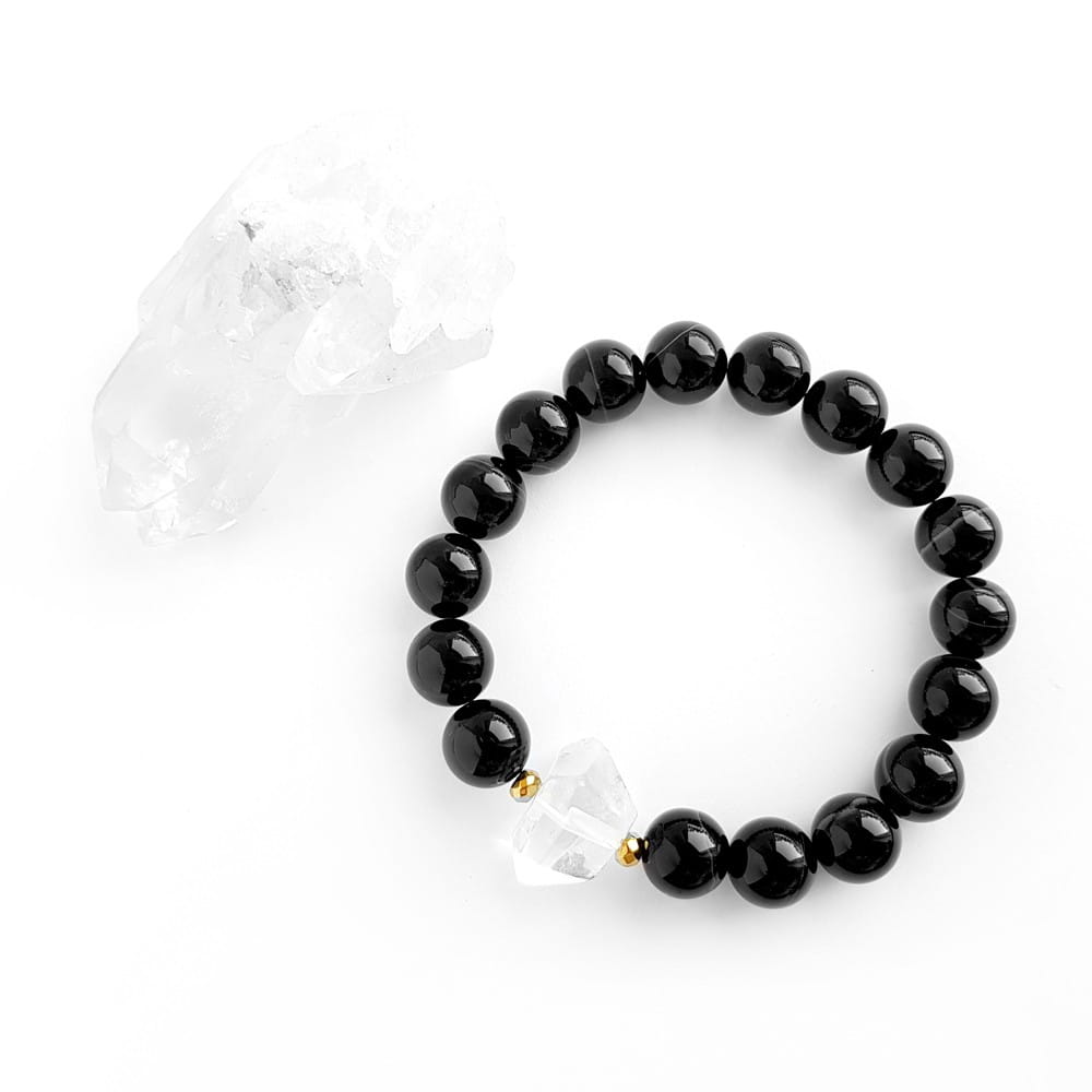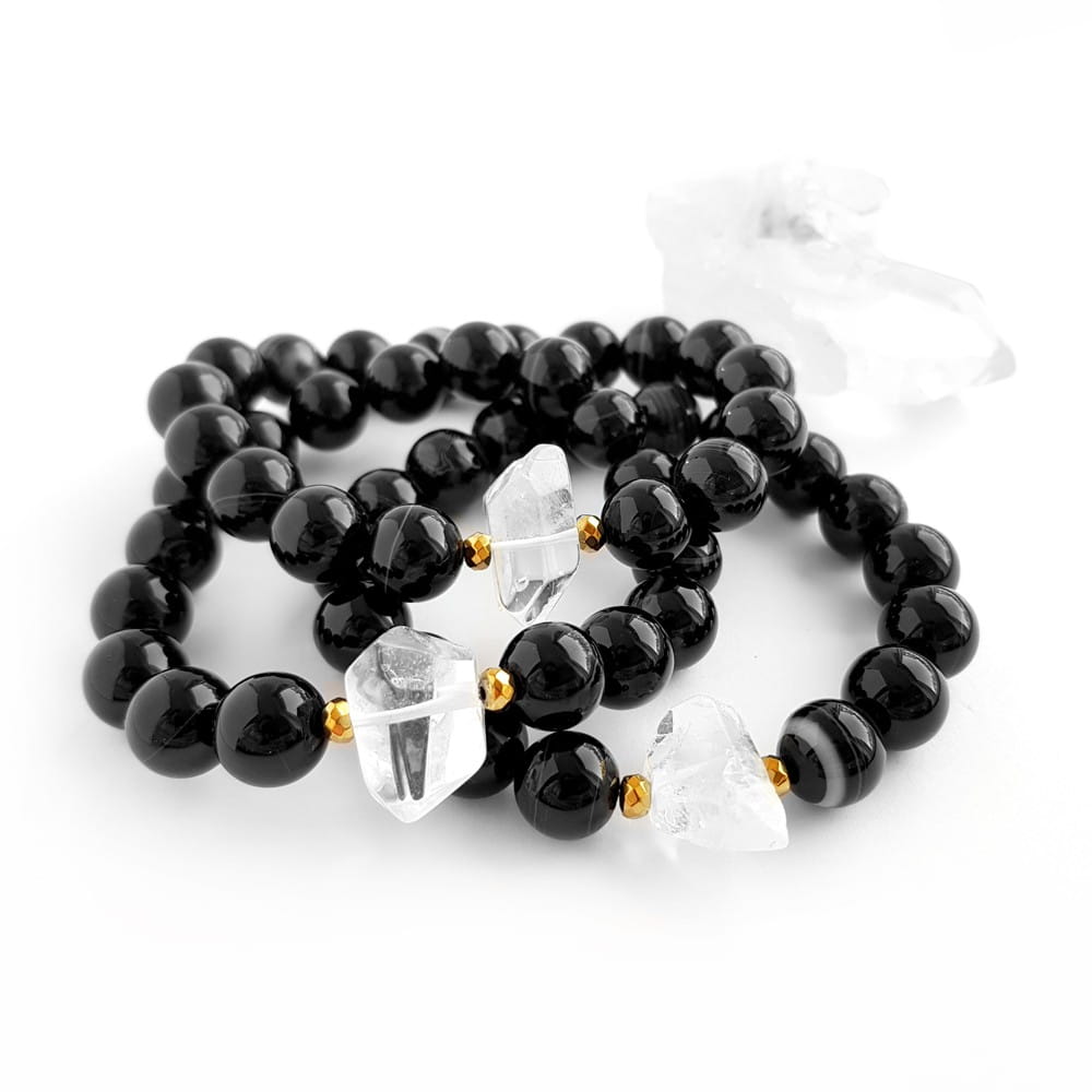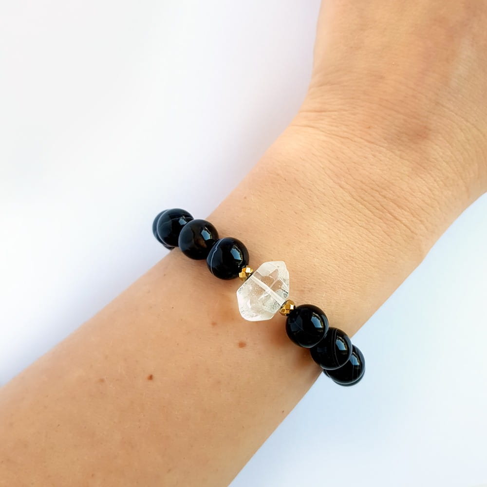Bransoletka wykonana z dużej bryłki kryształu górskiego, 10 mm kuleczek czarnego agatu pasiastego oraz przekładek z hematytu. Bazą bransoletki jest mocna, silikonowa gumka.