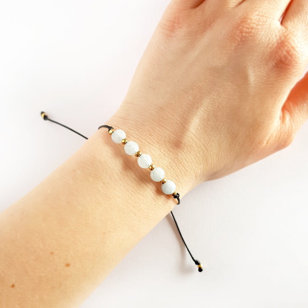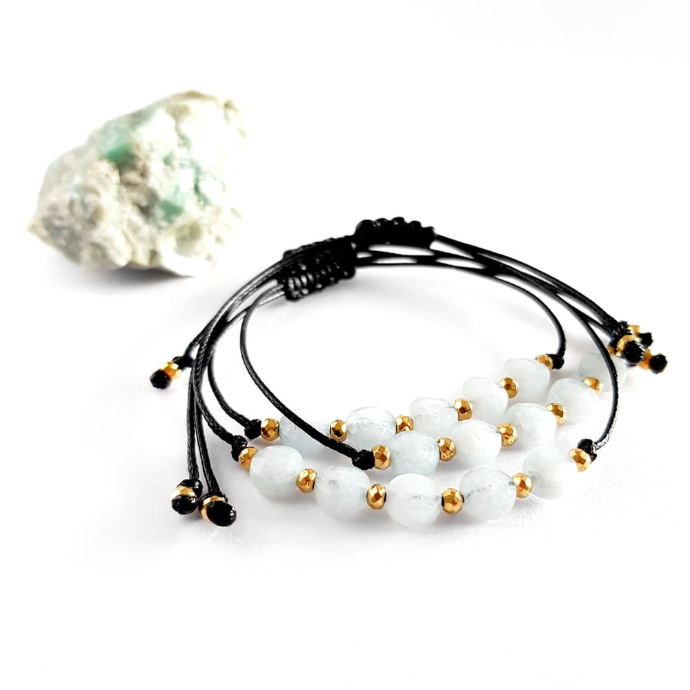 Bransoletka wykonana z kamieni naturalnych - akwamarynu, drobnych hematytów oraz nylonowego sznureczka.