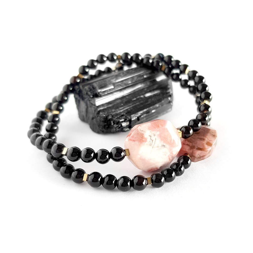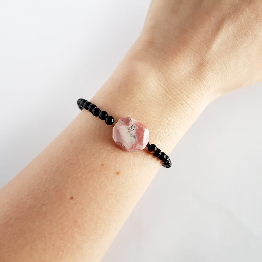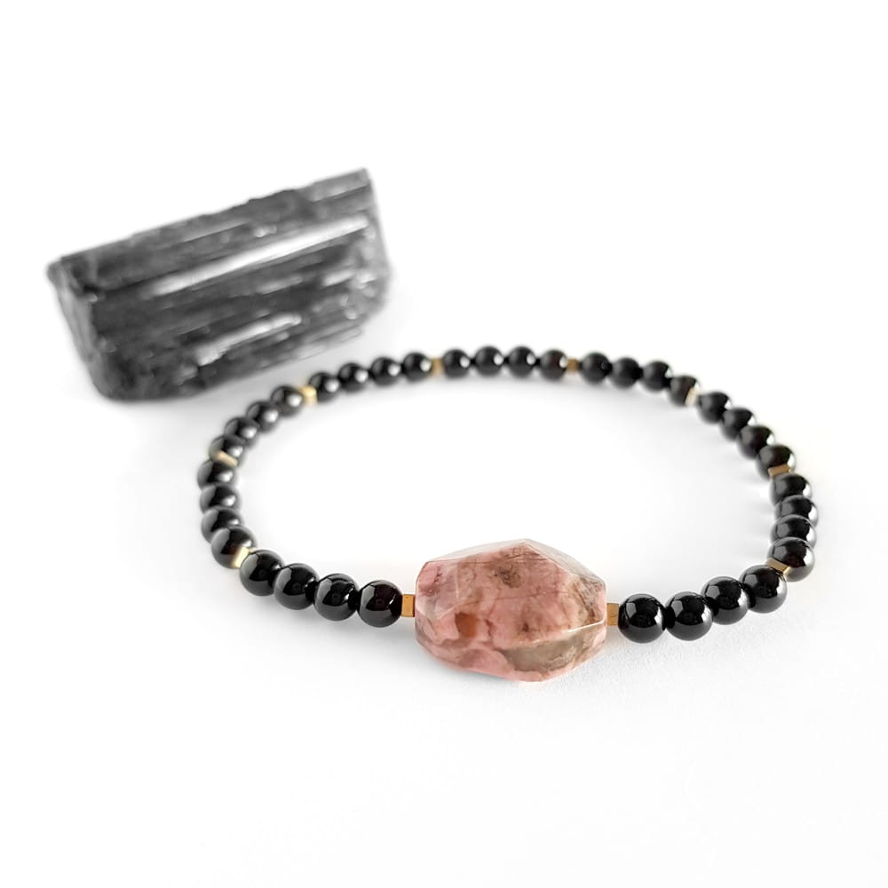 Bransoletka rodonit, czarny agat pasiasty i hematyt