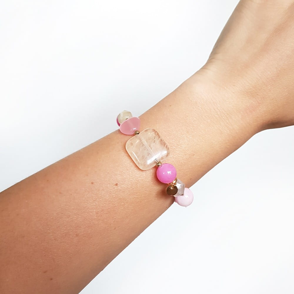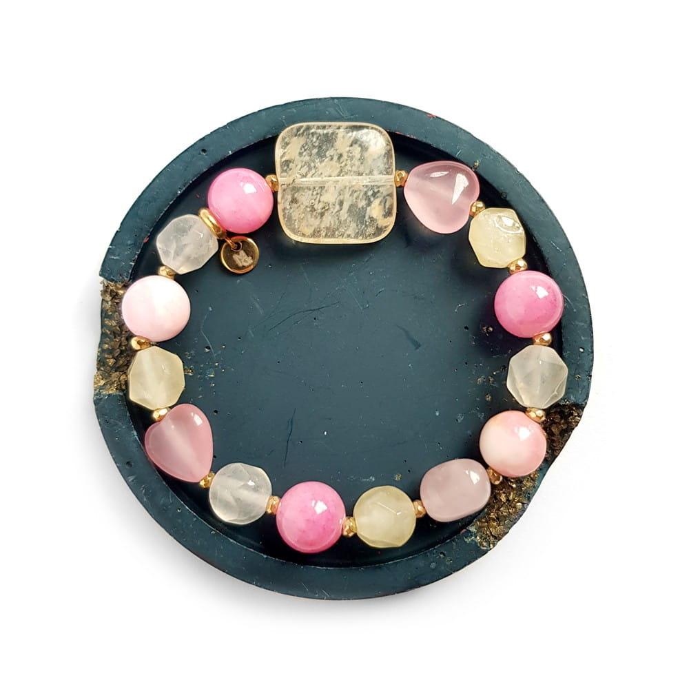Bransoletka wykonana z miksu kamieni. W bransoletce znajdziesz: beżowy kwarc mszysty, jadeit, kwarc różowy, marmurek i hematyt. Bazą bransoletki jest mocna, silikonowa gumka. Dodatek stanowi blaszka z logo Magneska.