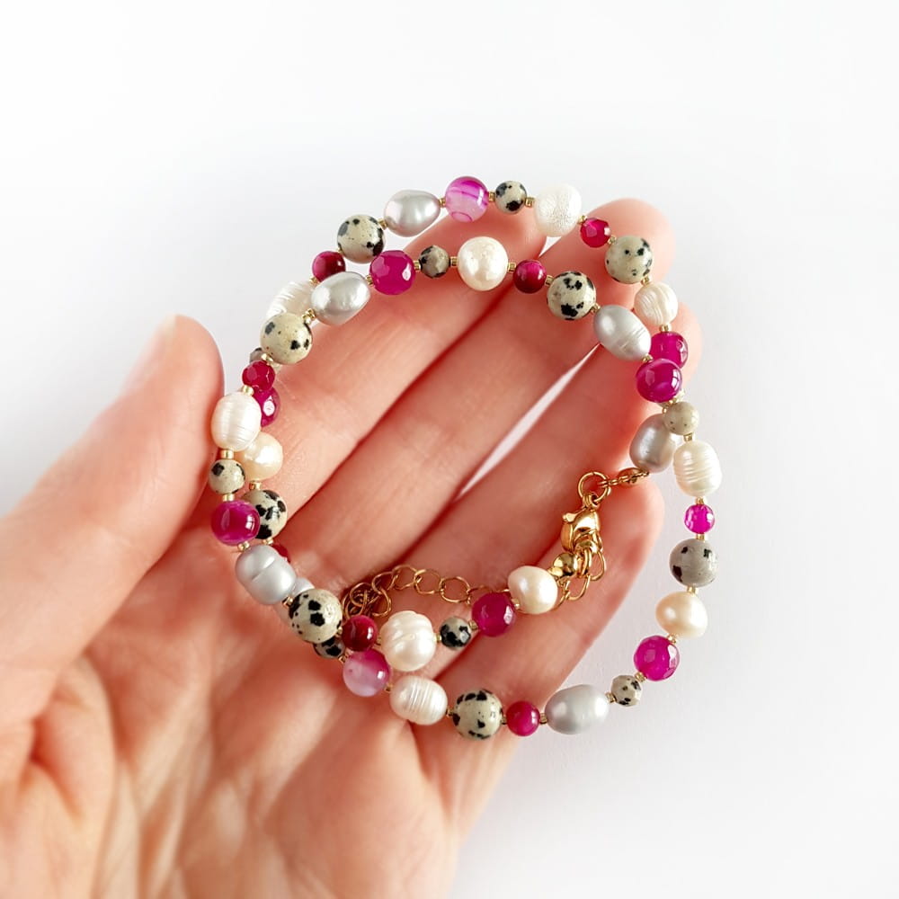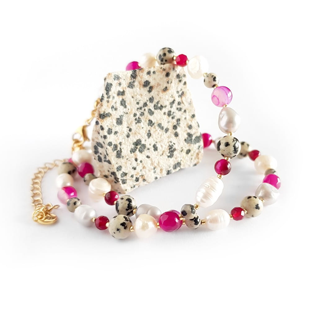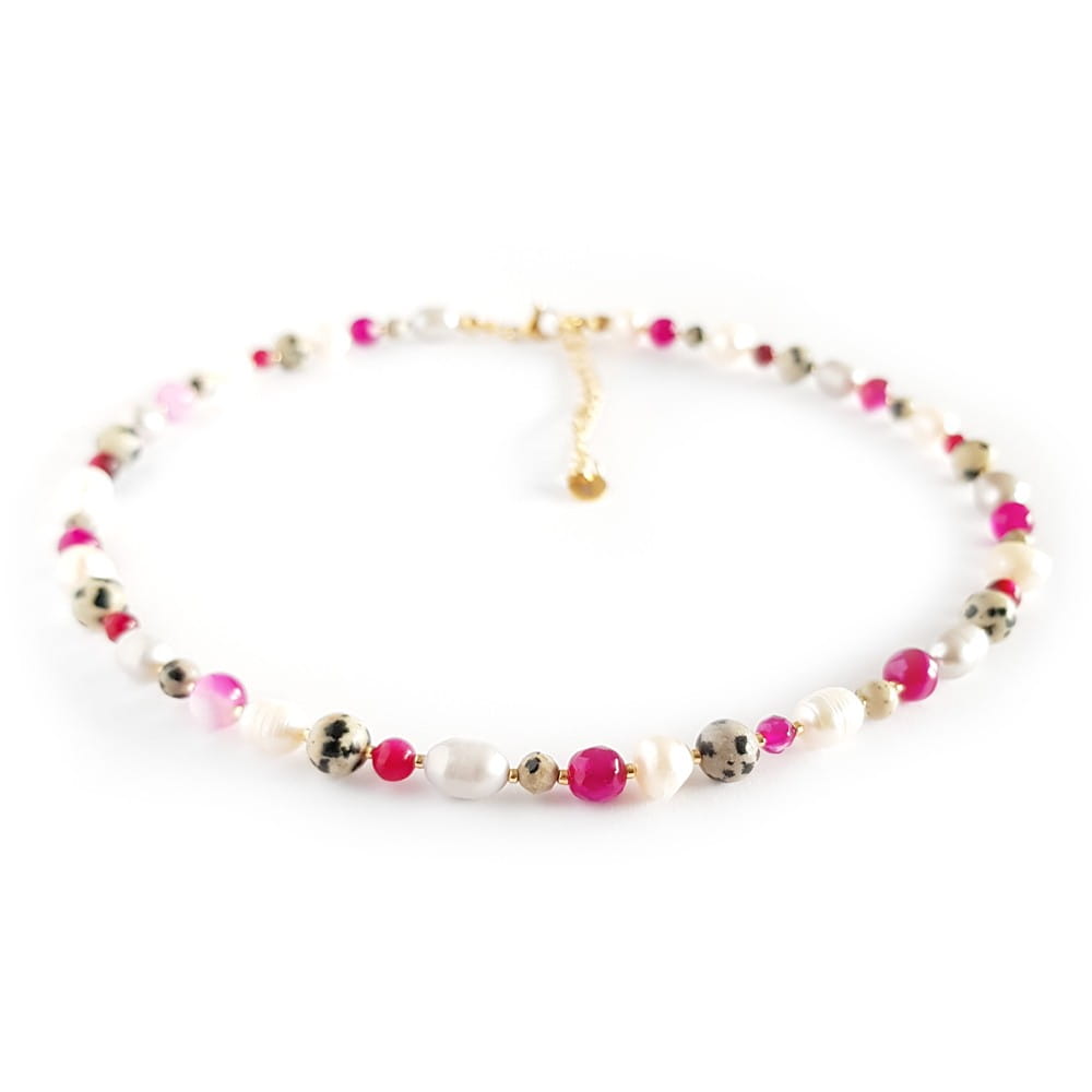 Naszyjnik wykonany z perełek hodowlanych, kamieni naturalnych - jaspisu dalmatyńczyka, barwionego na różowo jadeitu, różowego tygrysiego oka i różowego agatu, szklanych kuleczek w kolorze złotym oraz elementów metalowych ze stali chirurgicznej.