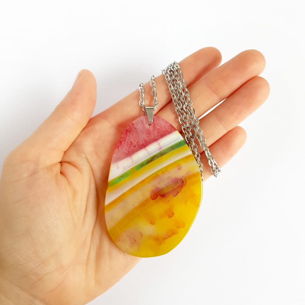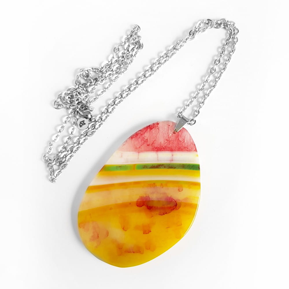 Naszyjnik wykonany z plastra barwionego agatu oraz łańcuszka ze stali chirurgicznej.