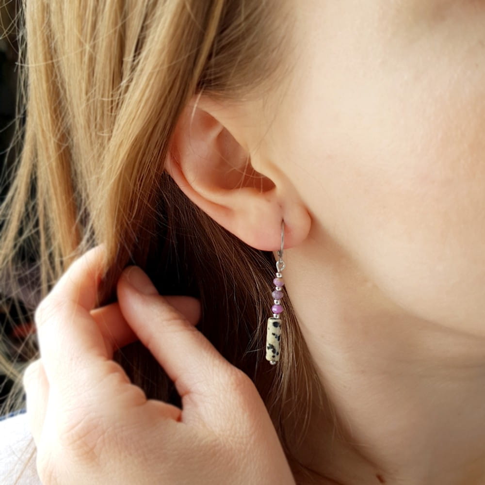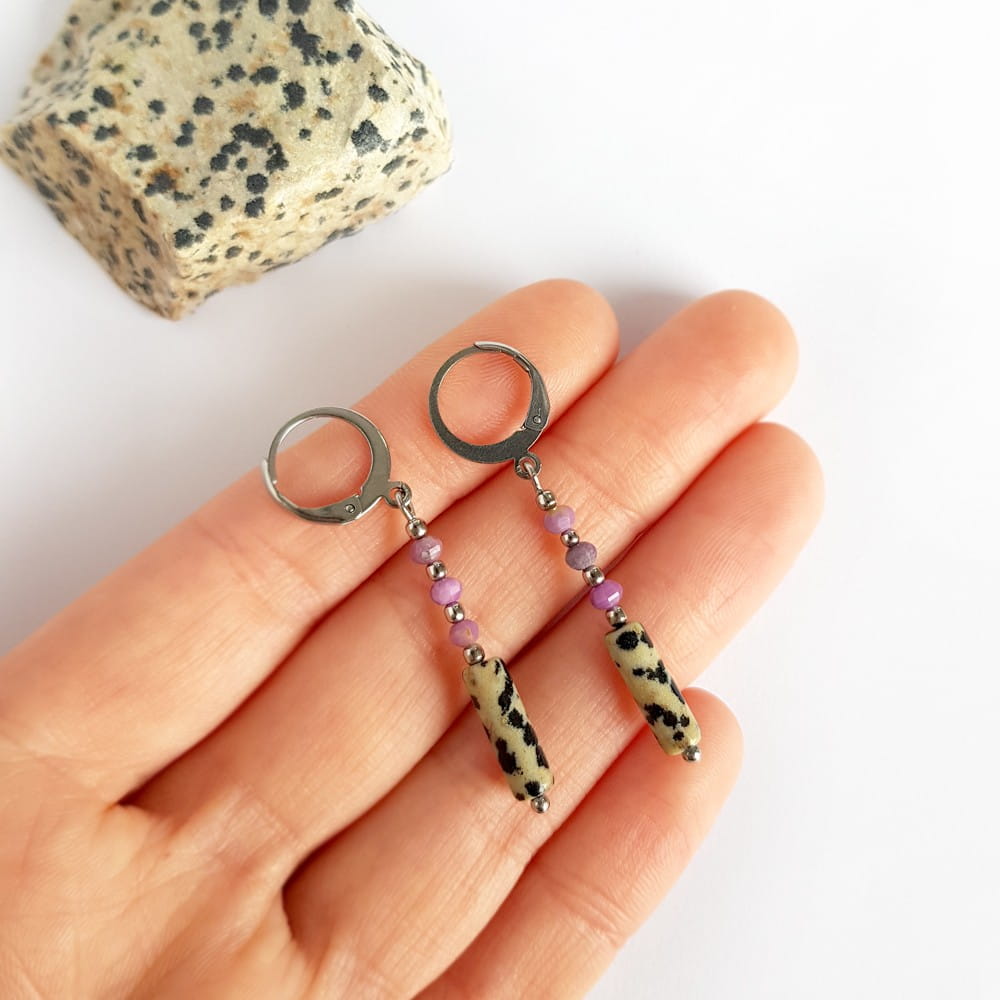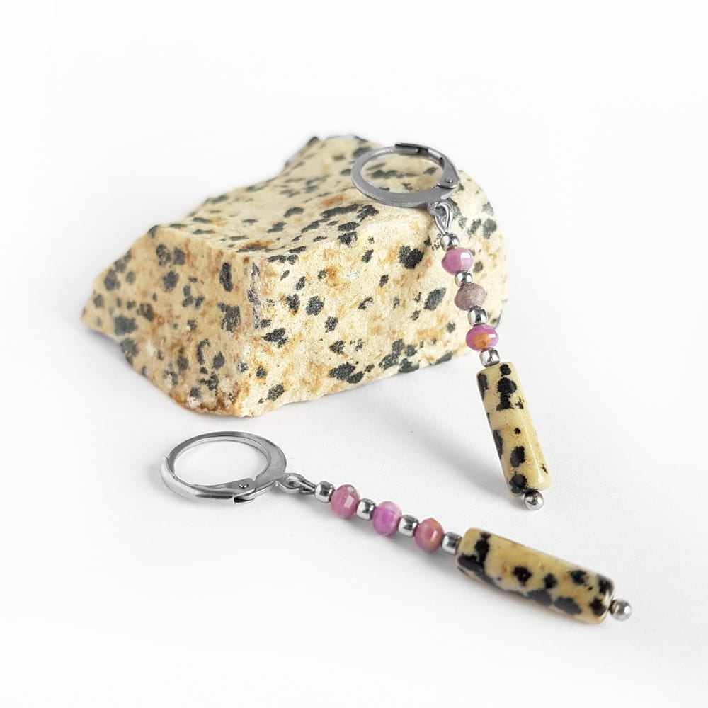 Kolczyki wiszące fosfosyderyt i jaspis dalmatyńczyk stal chirurgiczna