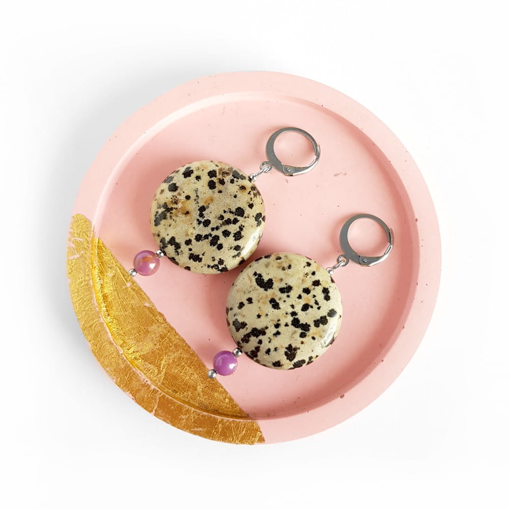 Kolczyki wiszące jaspis dalmatyńczyk i fosfosyderyt stal chirurgiczna