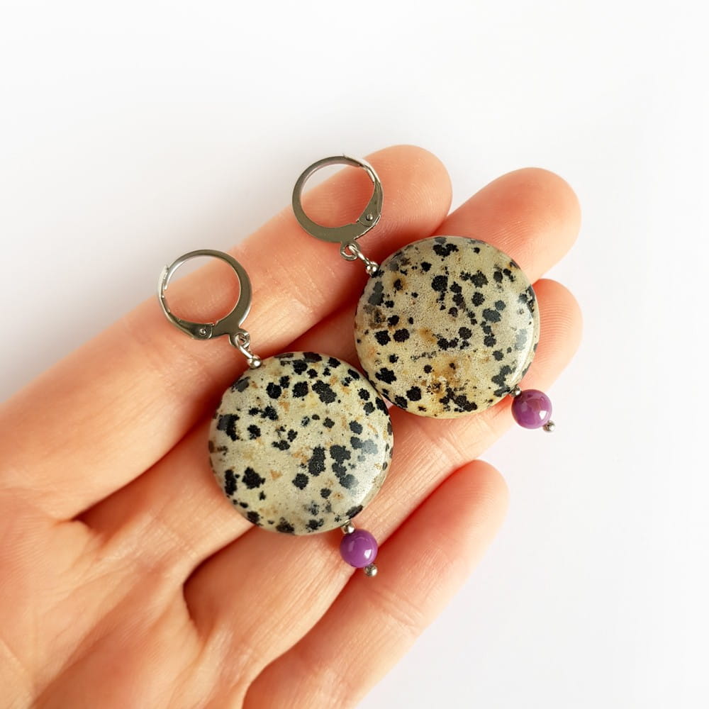 Kolczyki wykonane ręcznie z elementów metalowych ze stali chirurgicznej oraz kamieni naturalnych - jaspisu dalmatyńczyka i fosfosyderytu.