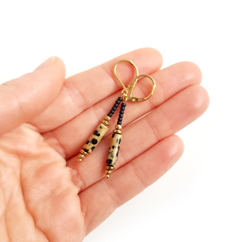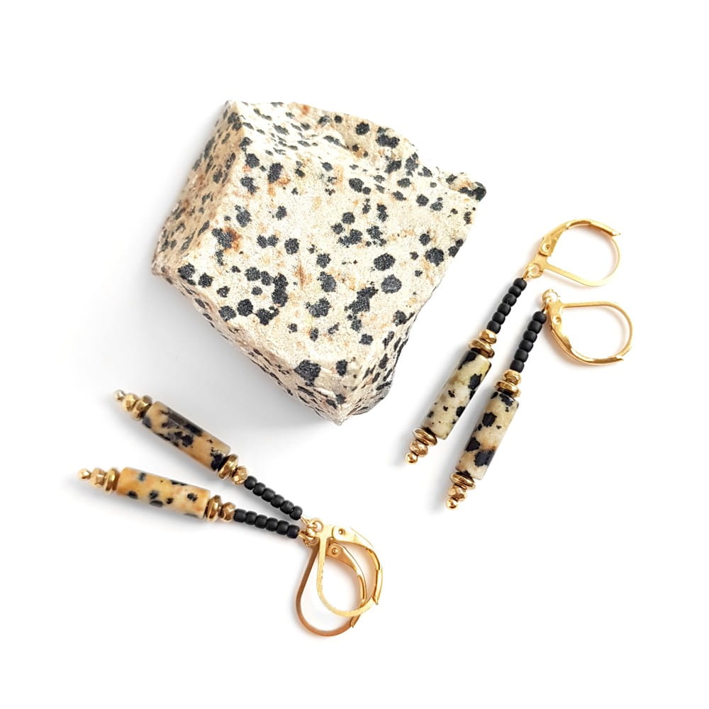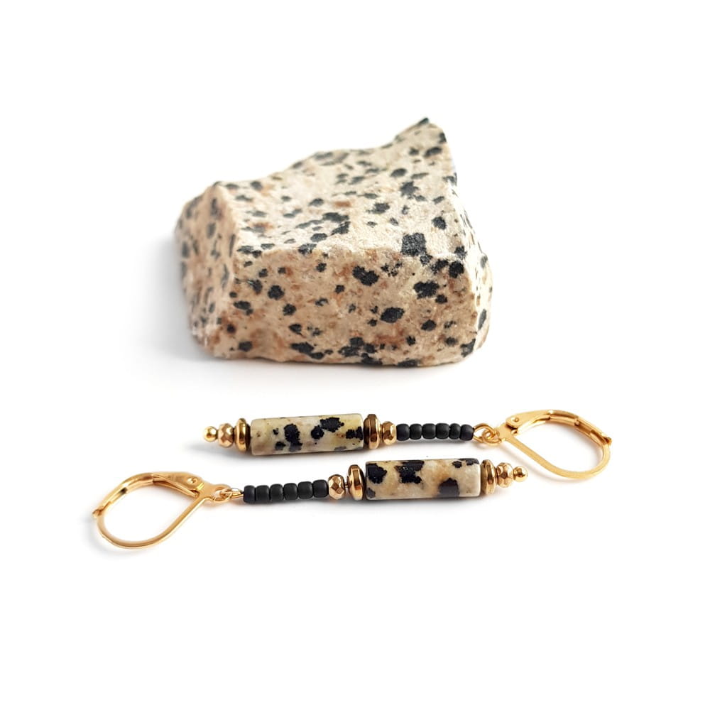 Elegance kolczyki wiszące jaspis dalmatyńczyk, hematyt i złota stal chirurgiczna
