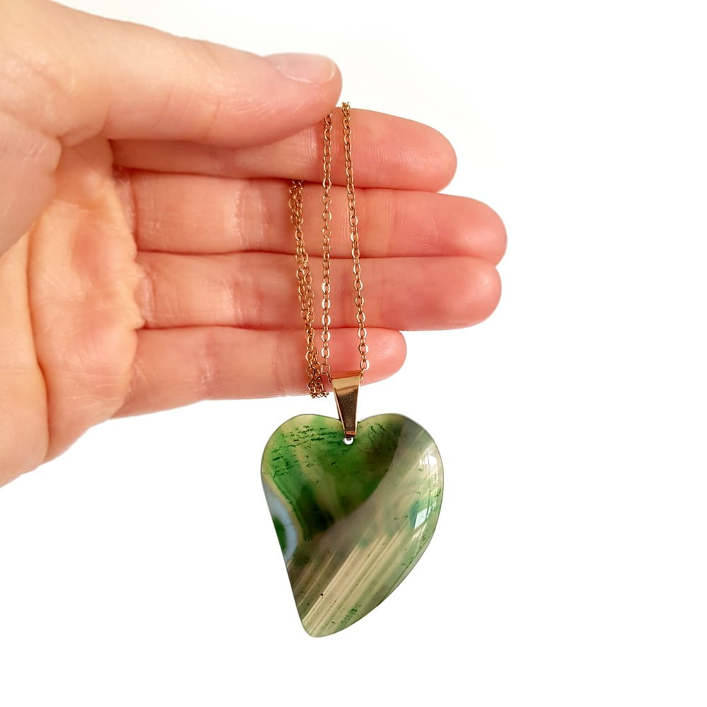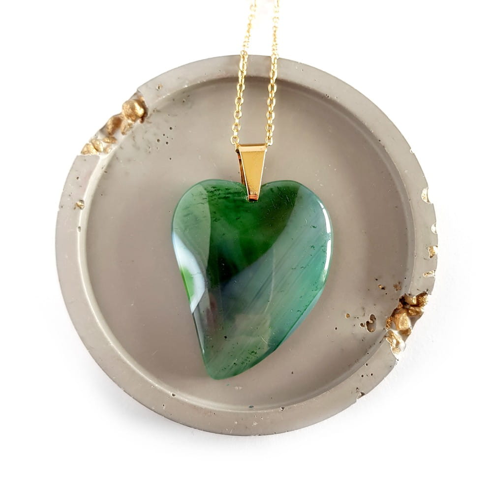 Naszyjnik unikat agat zielony podłużne serce na łańcuszku złota stal chirurgiczna