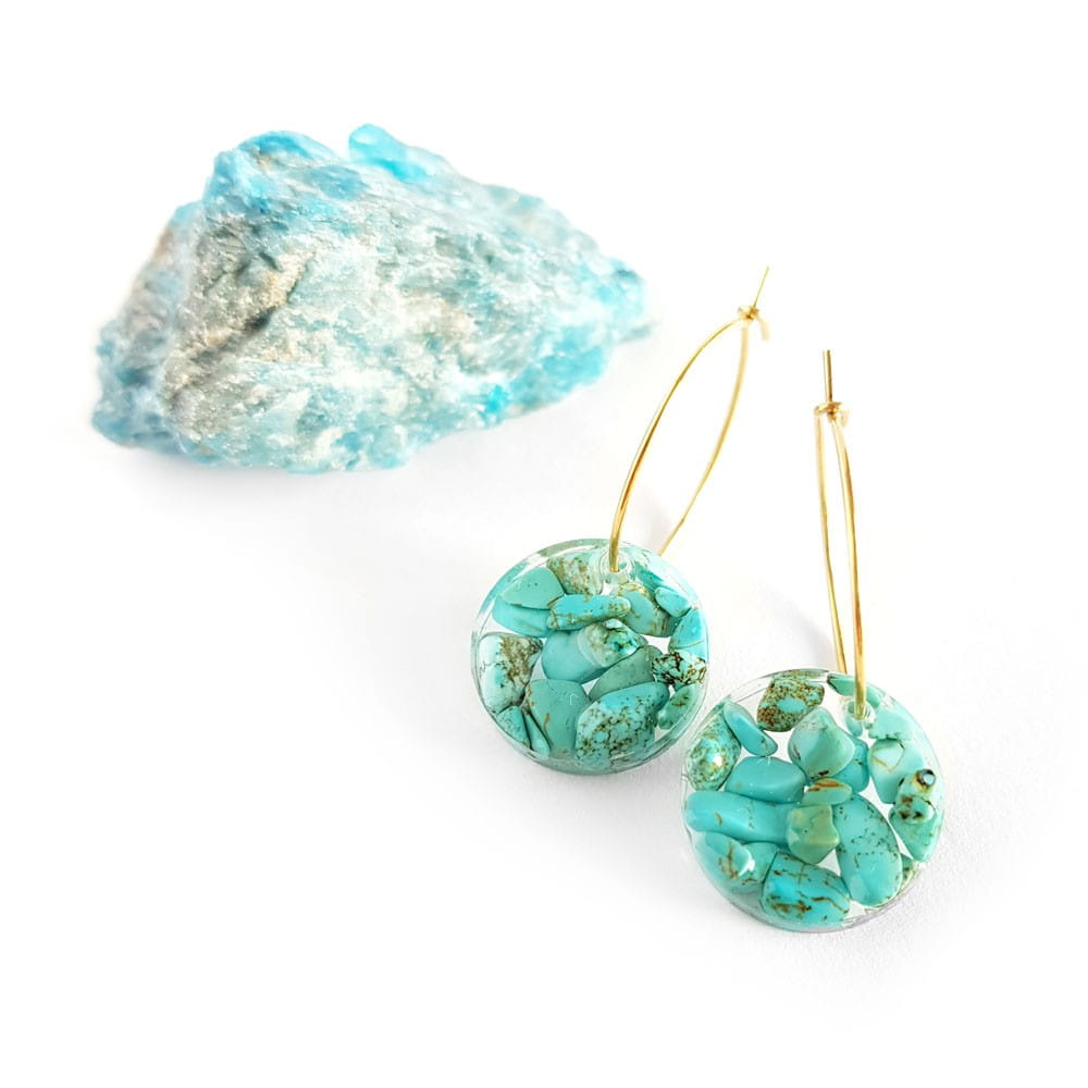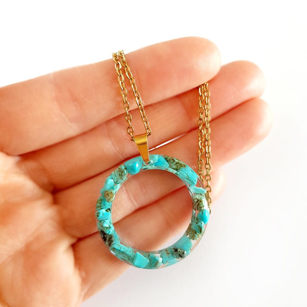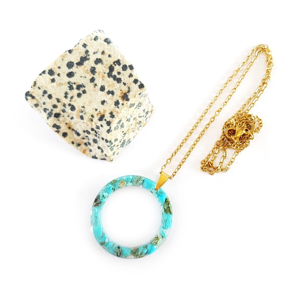 Naszyjnik wykonany z barwionego na niebiesko magnezytu zatopionego w żywicy jubilerskiej oraz elementów metalowych ze stali chirurgicznej.