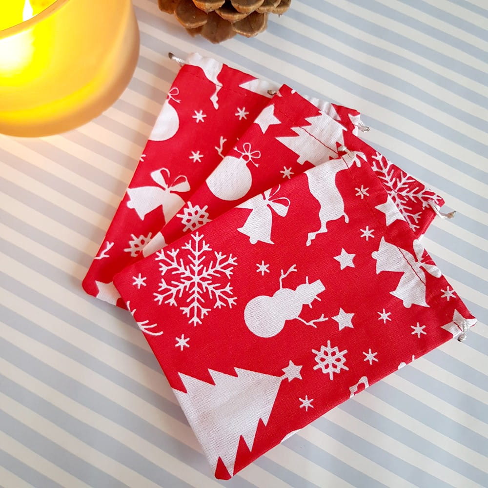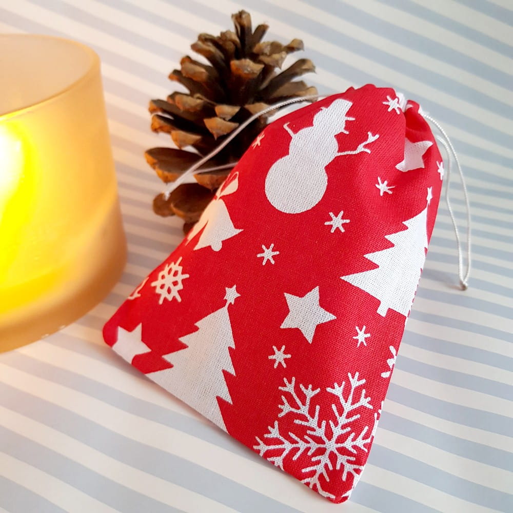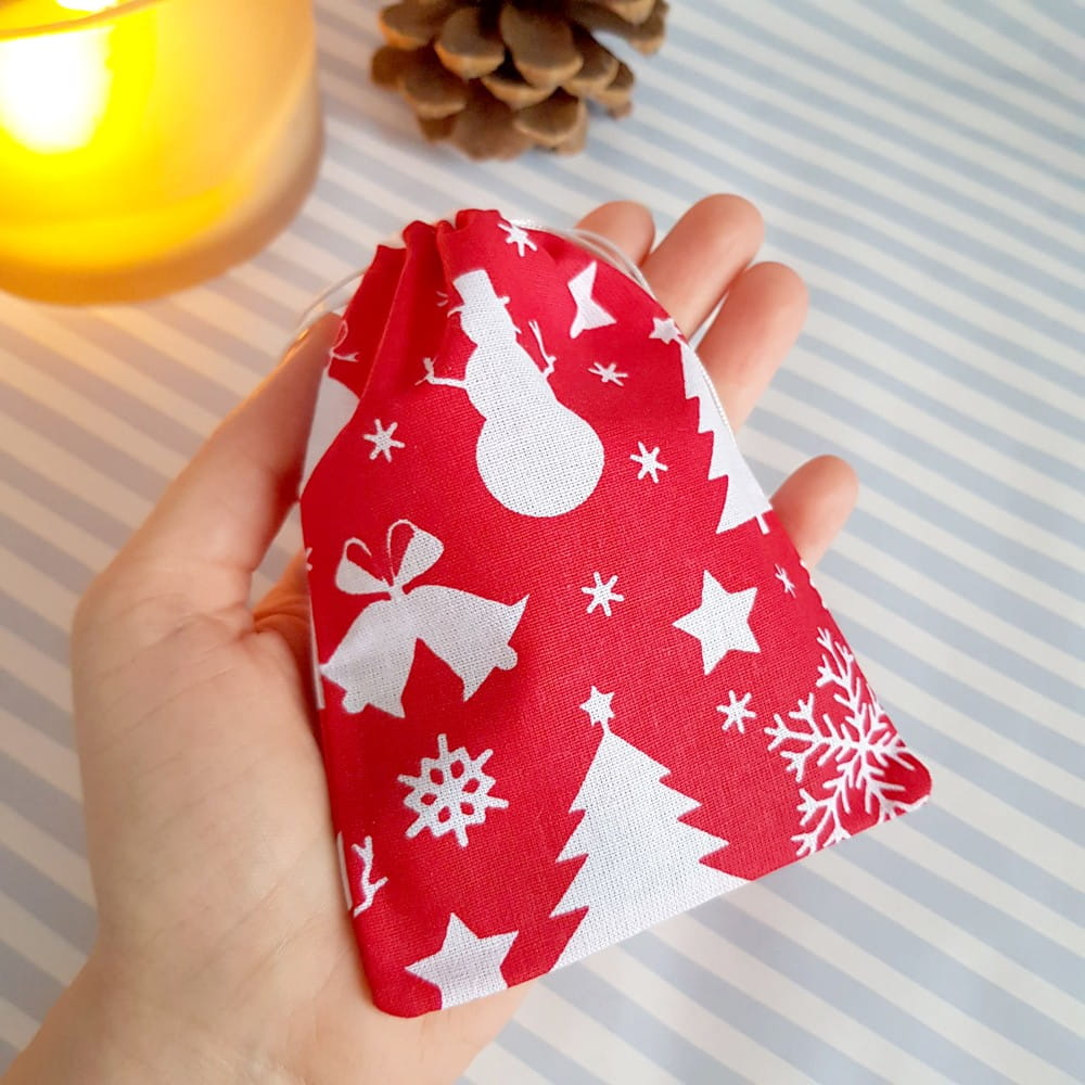 Woreczek wykonany z bawełnianej tkaniny w świąteczny print na czerwonym tle.