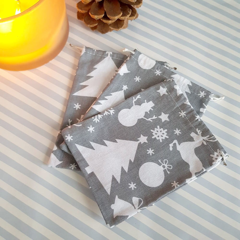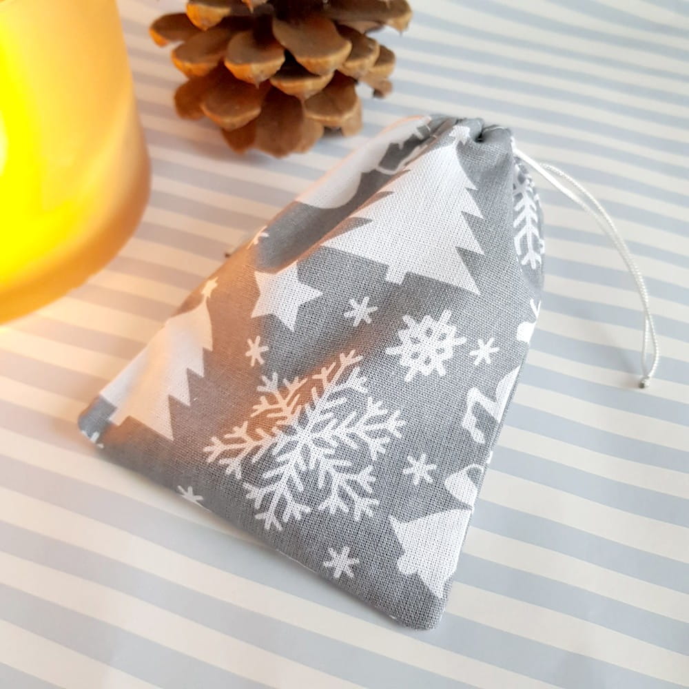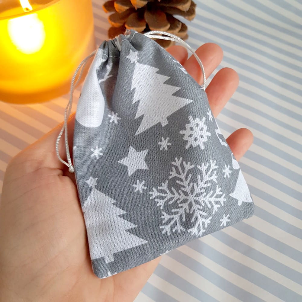 Woreczek wykonany z bawełnianej tkaniny w świąteczny print na szarym tle.