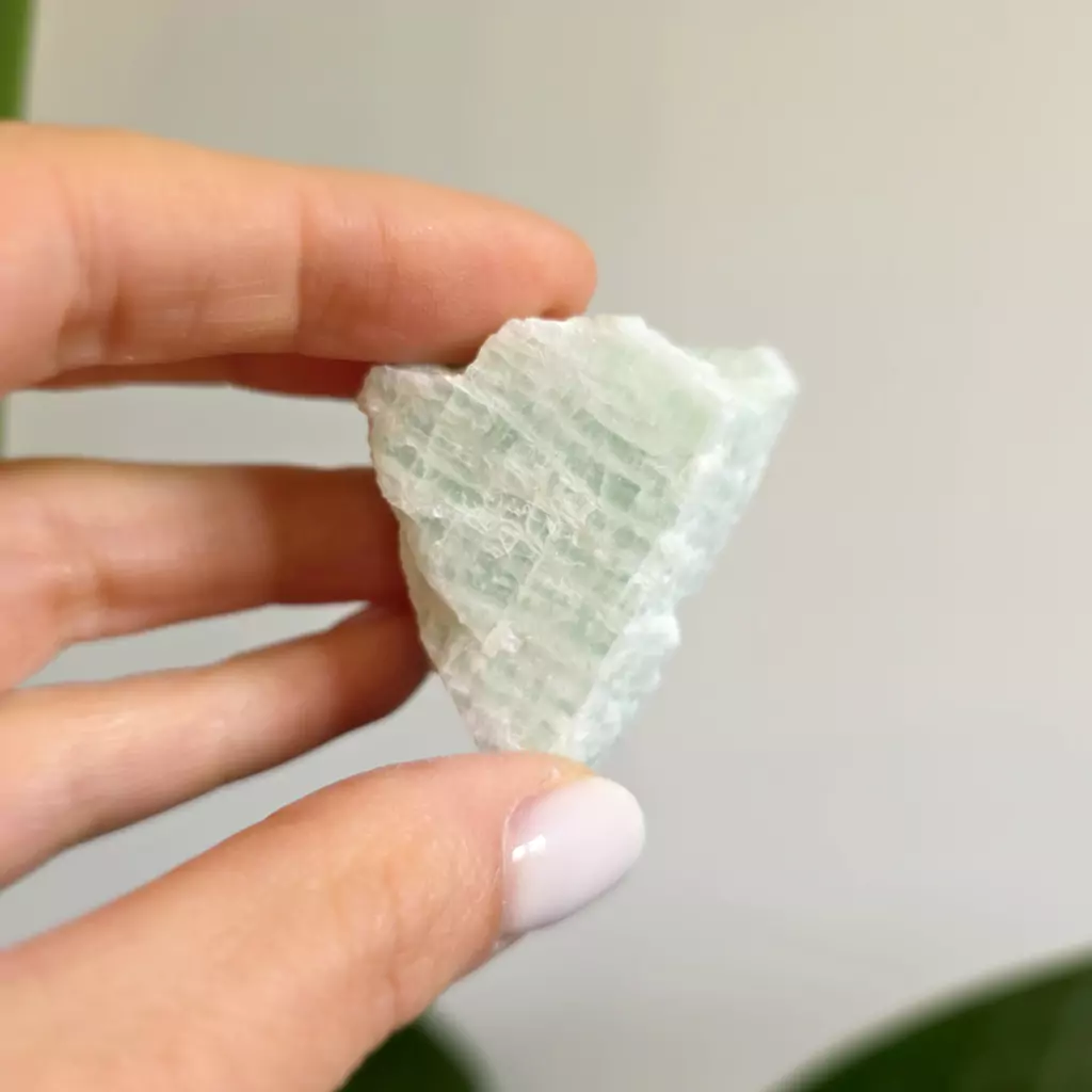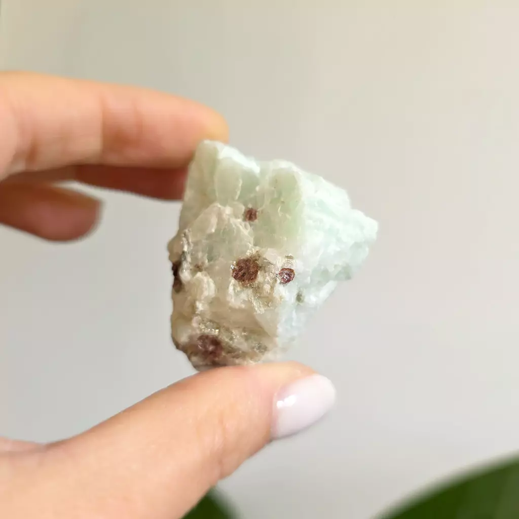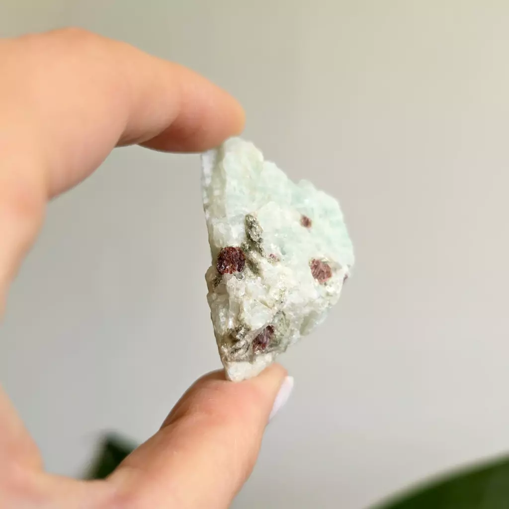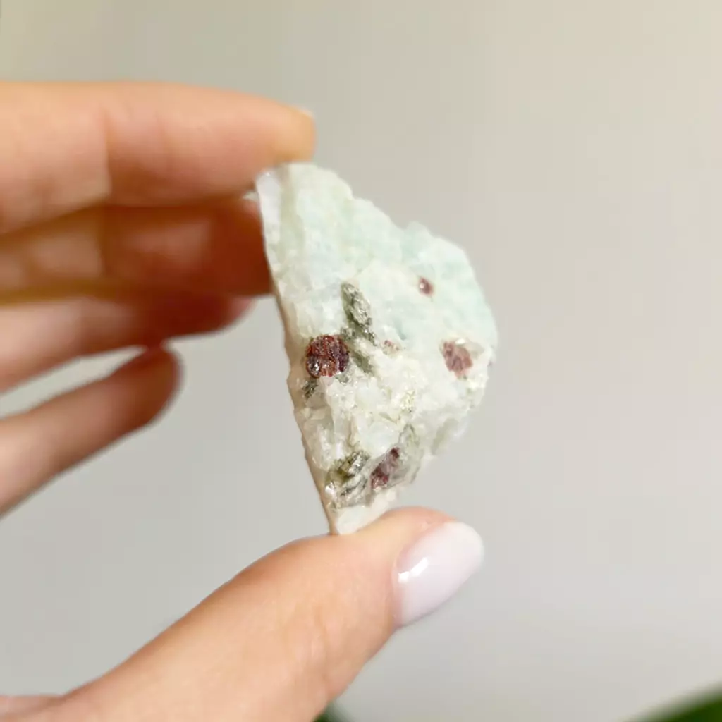 en wyjątkowy okaz amazonitu to prawdziwe dzieło natury – przenikają go intensywnie różowe inkluzje rubelitu i skrzące, trawiaste refleksy fuchsytu. To połączenie trzech potężnych minerałów – każdy z nich wnosi inną wibrację, razem tworząc harmonijną, transformującą całość.