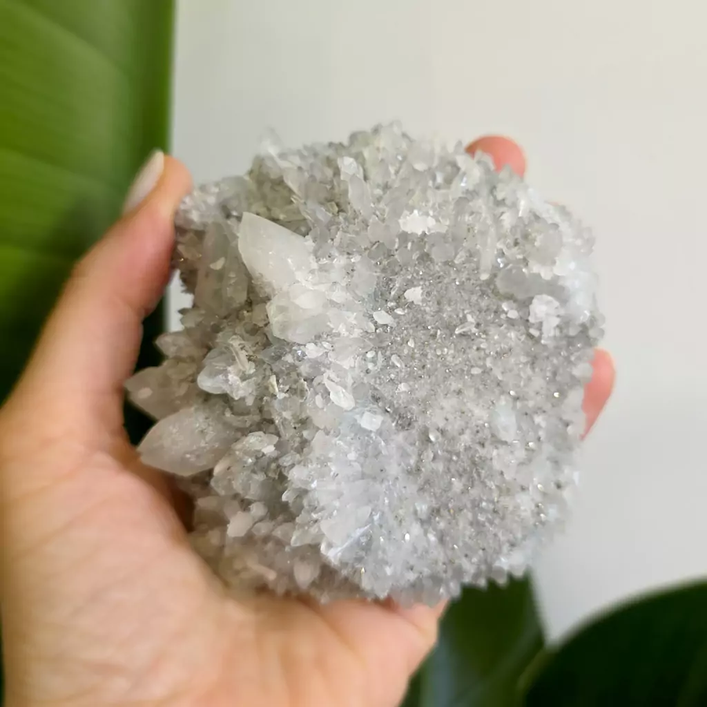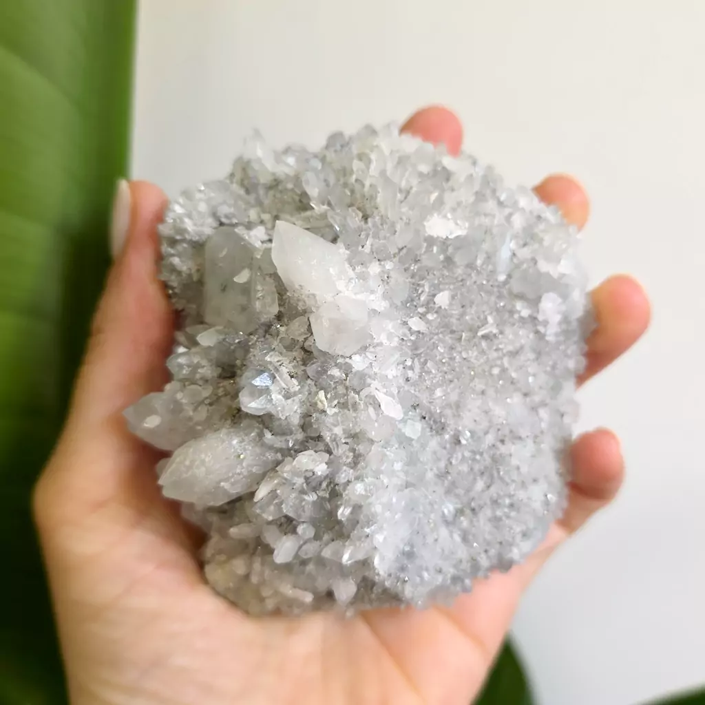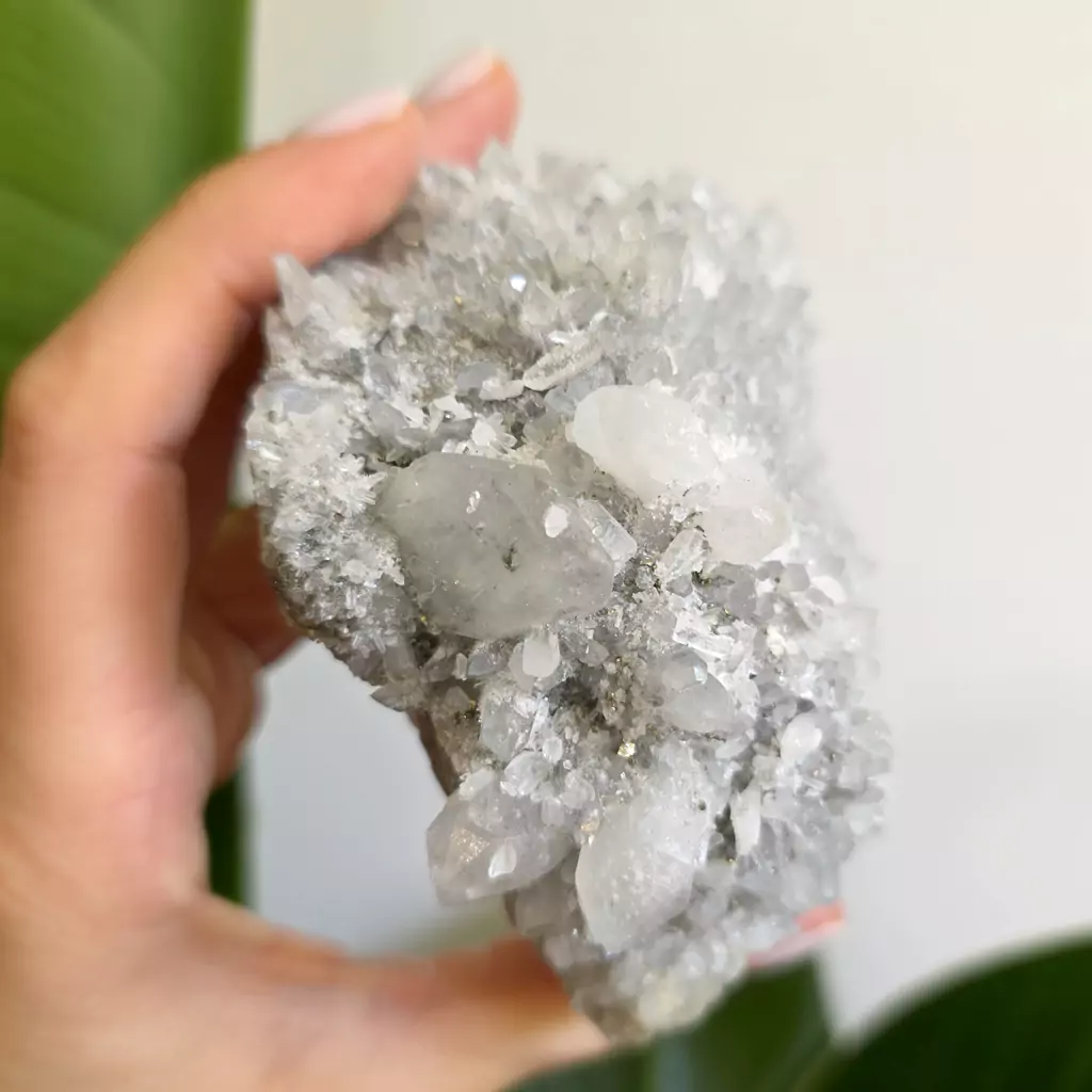 Delikatna kompozycja kryształów białego i lekko szarego kwarcu o subtelnej, eterycznej urodzie. Ten naturalny okaz z górniczego regionu Cavnic w Rumunii emanuje spokojem, równowagą i czystością. Szczotka idealna do energetycznego oczyszczania przestrzeni, medytacji i pracy z intencją.