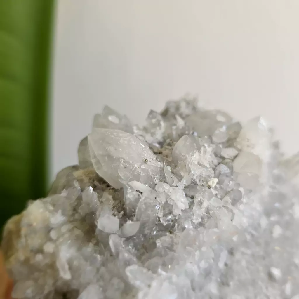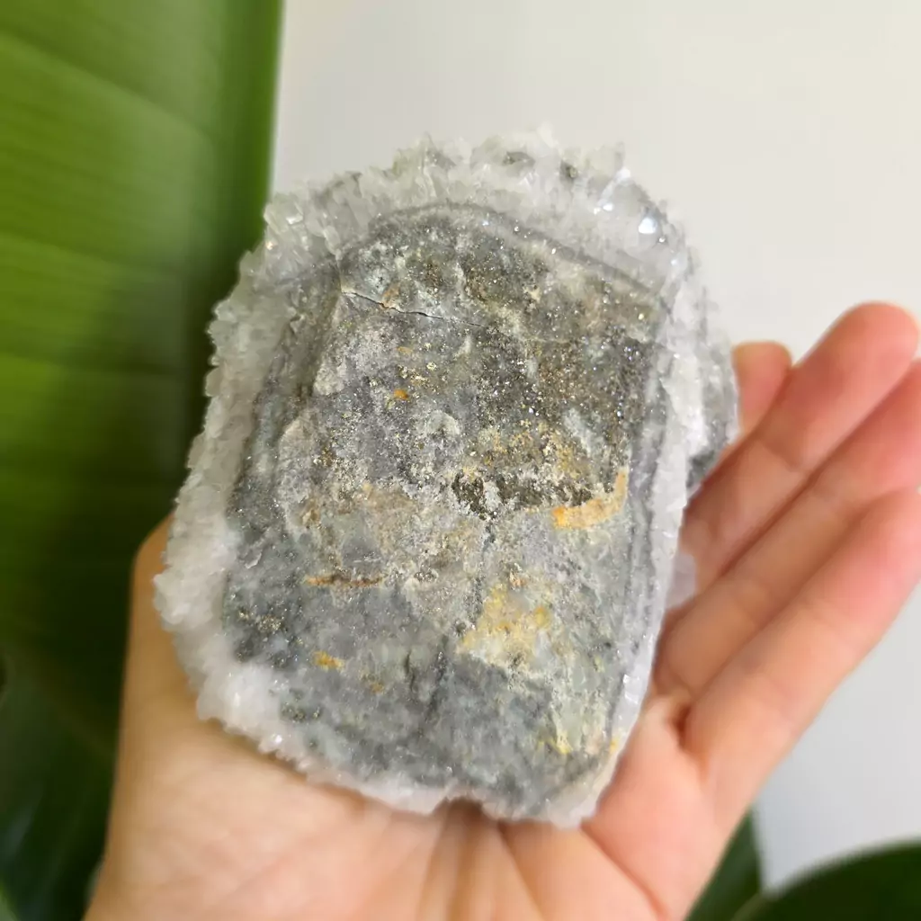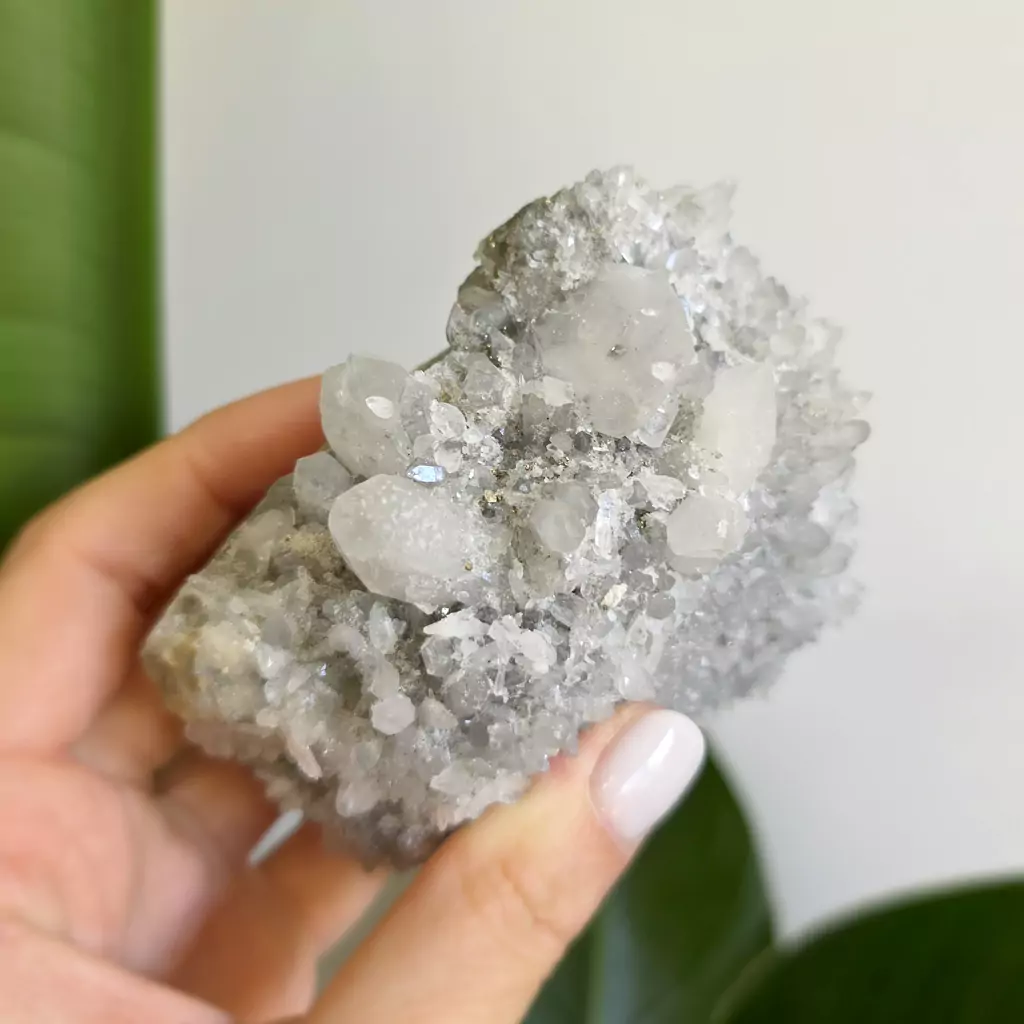 Delikatna kompozycja kryształów białego i lekko szarego kwarcu o subtelnej, eterycznej urodzie. Ten naturalny okaz z górniczego regionu Cavnic w Rumunii emanuje spokojem, równowagą i czystością. Szczotka idealna do energetycznego oczyszczania przestrzeni, medytacji i pracy z intencją.