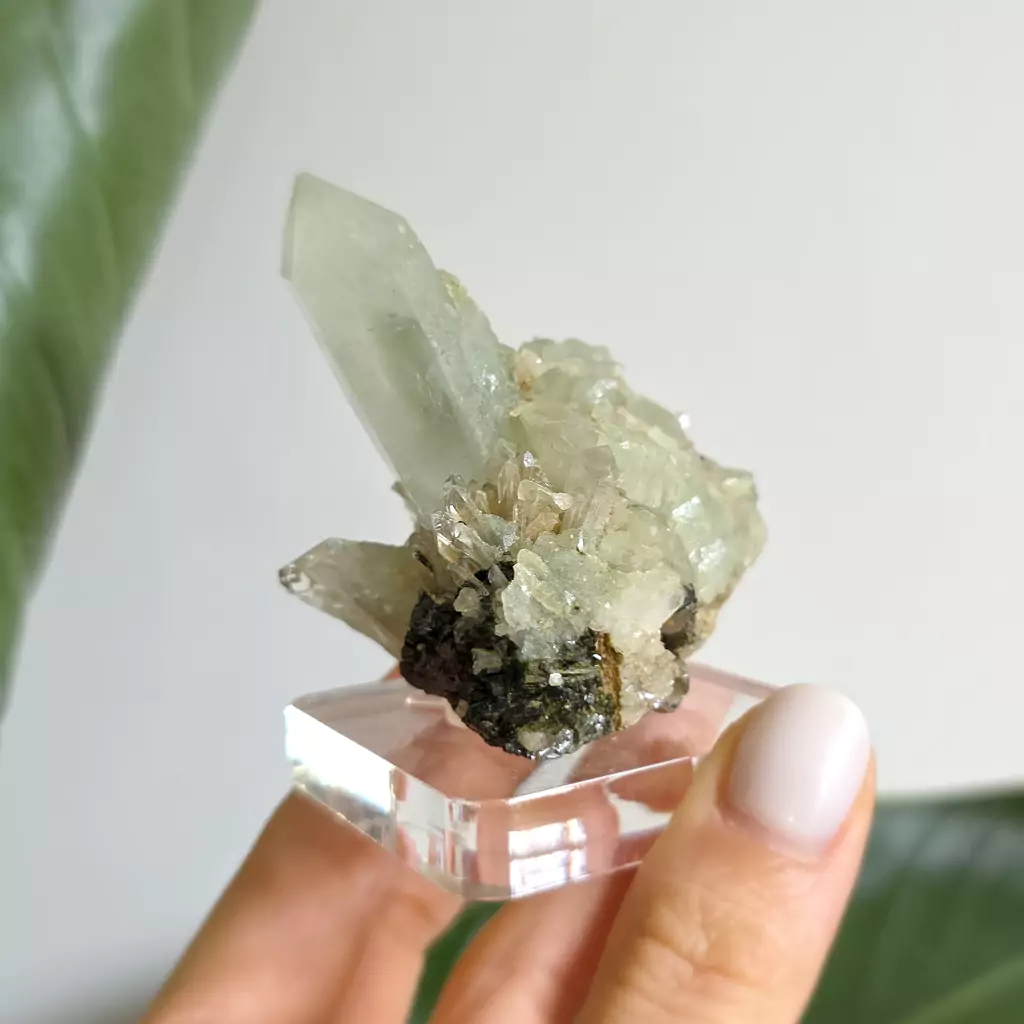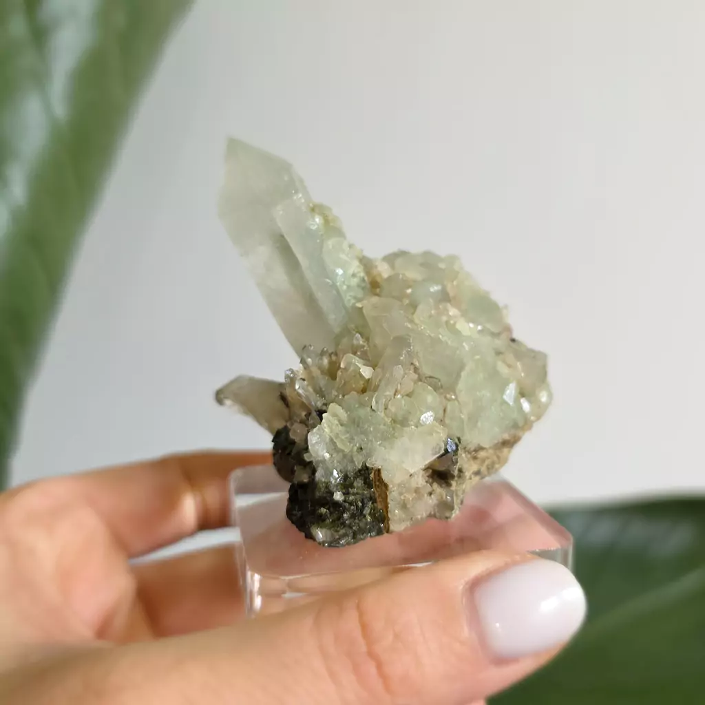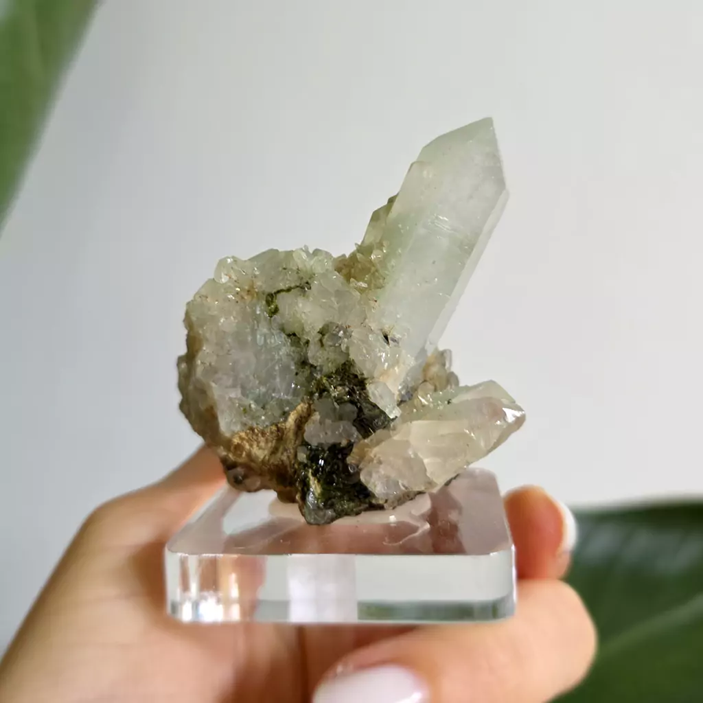 Kwarc zielony z epidotem - szczotka na podstawce - o wadze 100 g (z podstawką 127 g).