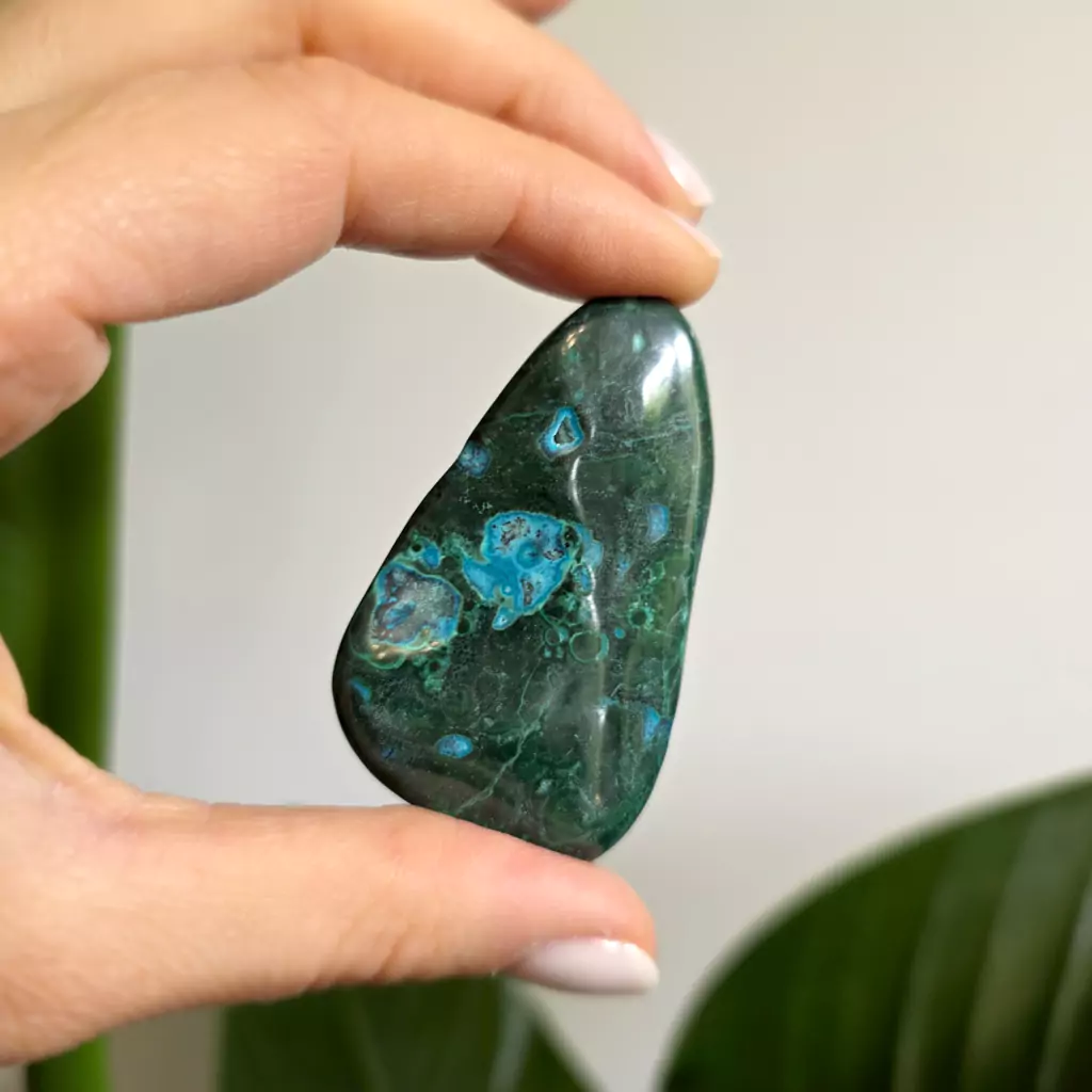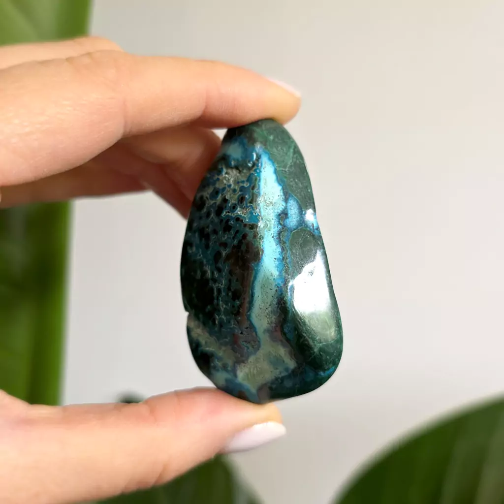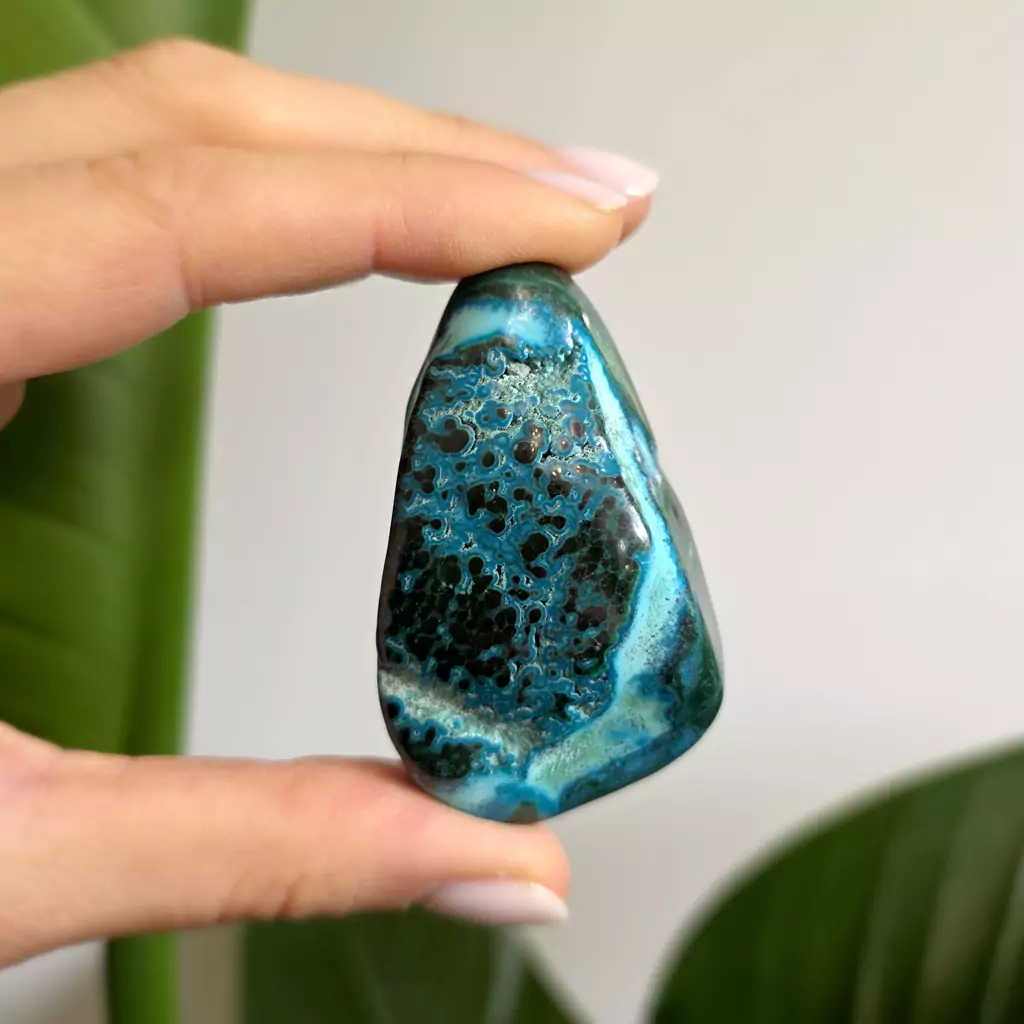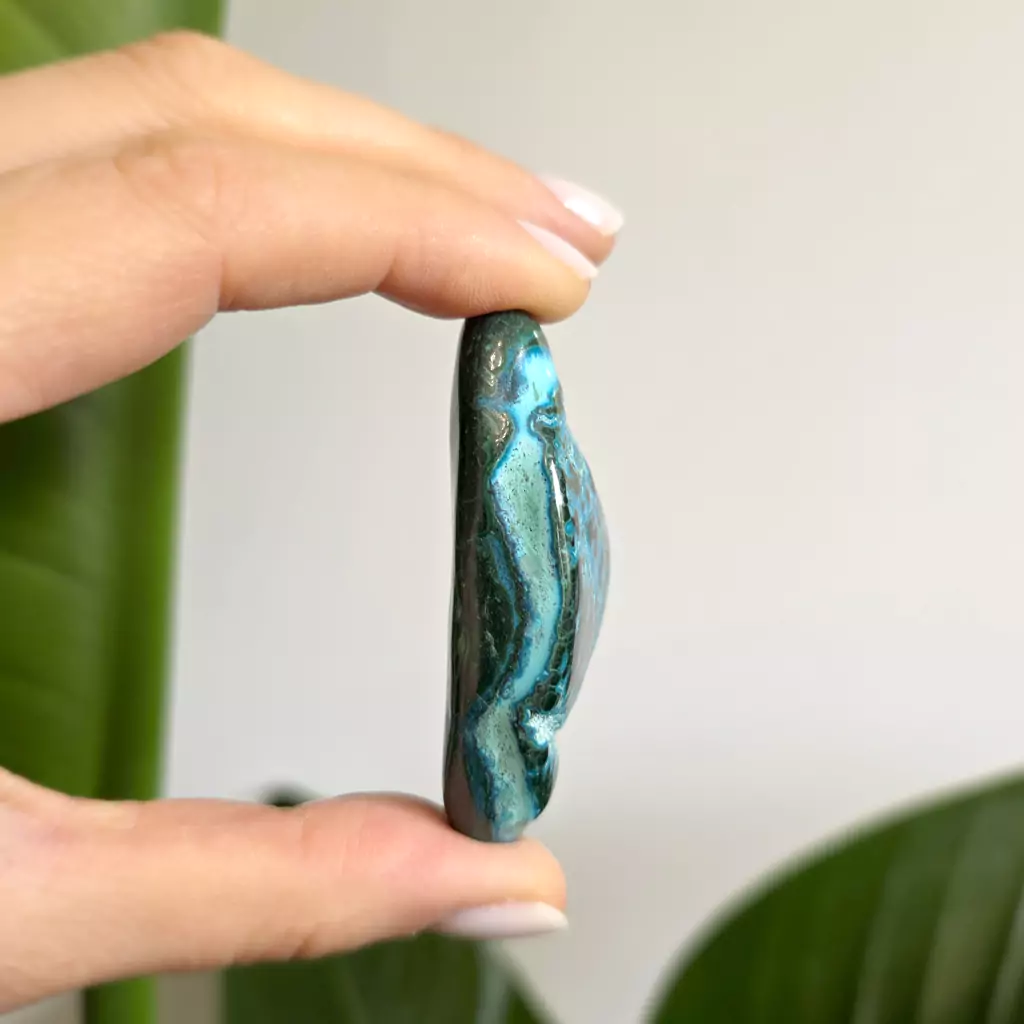 Chryzokola to kamień spokoju, uzdrawiania i komunikacji. Łagodzi stres, przynosi emocjonalną równowagę i pomaga w wyrażaniu uczuć. Wspiera wewnętrzny spokój, ułatwia medytację i duchowy rozwój. Chryzokola harmonizuje czakrę gardła, wspomagając szczerość i jasność wypowiedzi, a także sprzyja regeneracji, wspierając zdrowie fizyczne i emocjonalne.