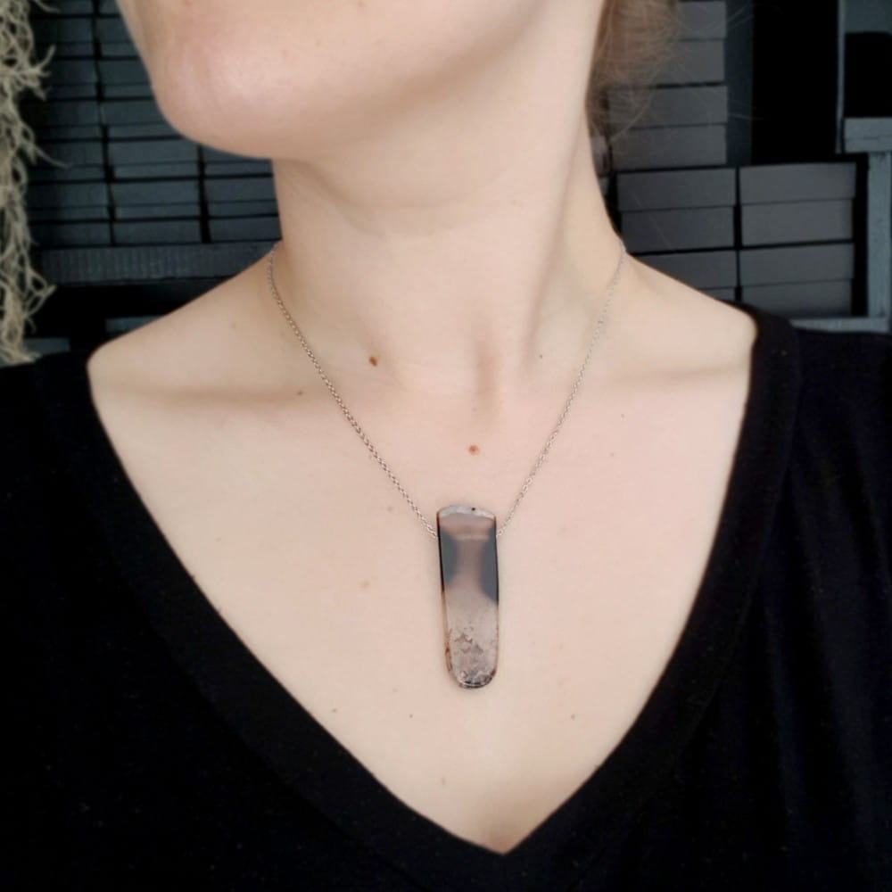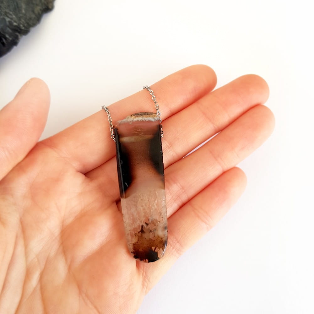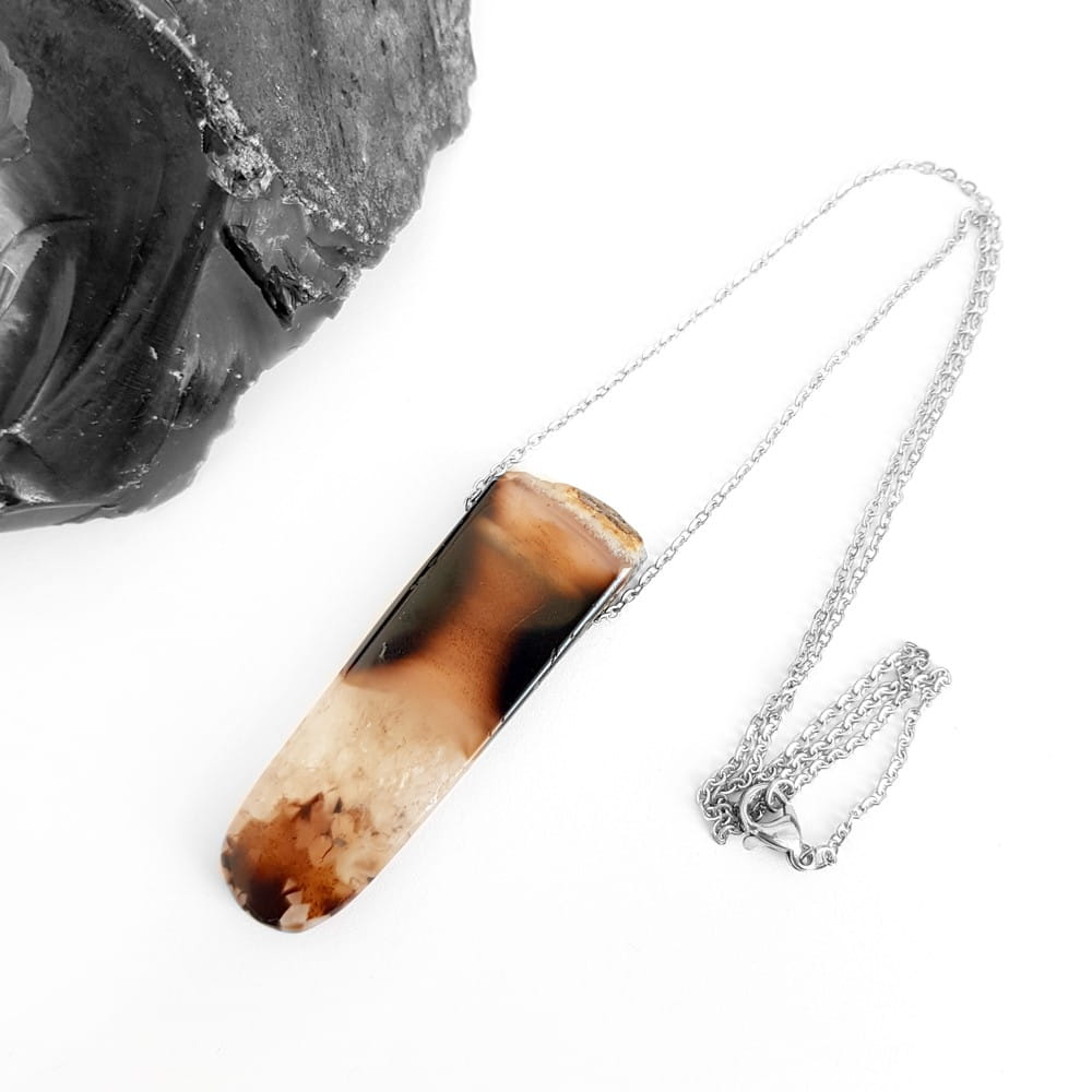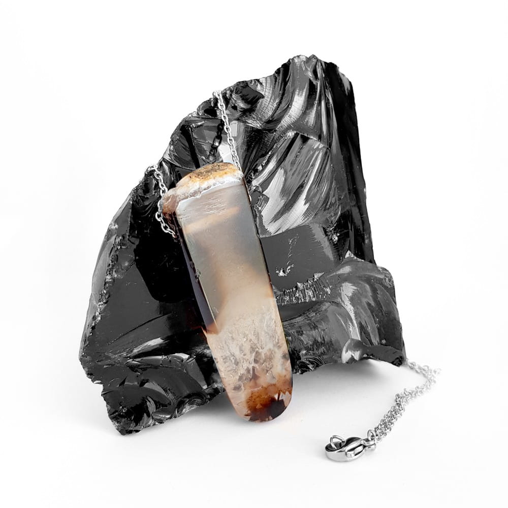 Naszyjnik wykonany z płaskiej bryłki agatu oraz elementów metalowych ze stali chirurgicznej.