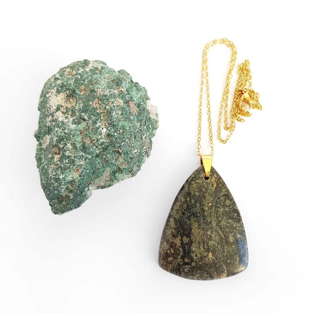 Naszyjnik wykonany z jaspisu kambaba w kształcie zaokrąglonego trójkąta oraz elementów metalowych ze stali chirurgicznej.