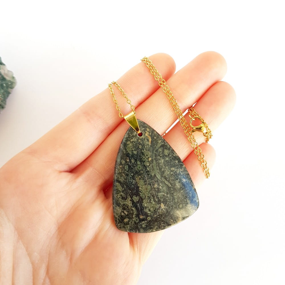 Naszyjnik unikat jaspis kambaba trójkąt na złotym łańcuszku stal chirurgiczna