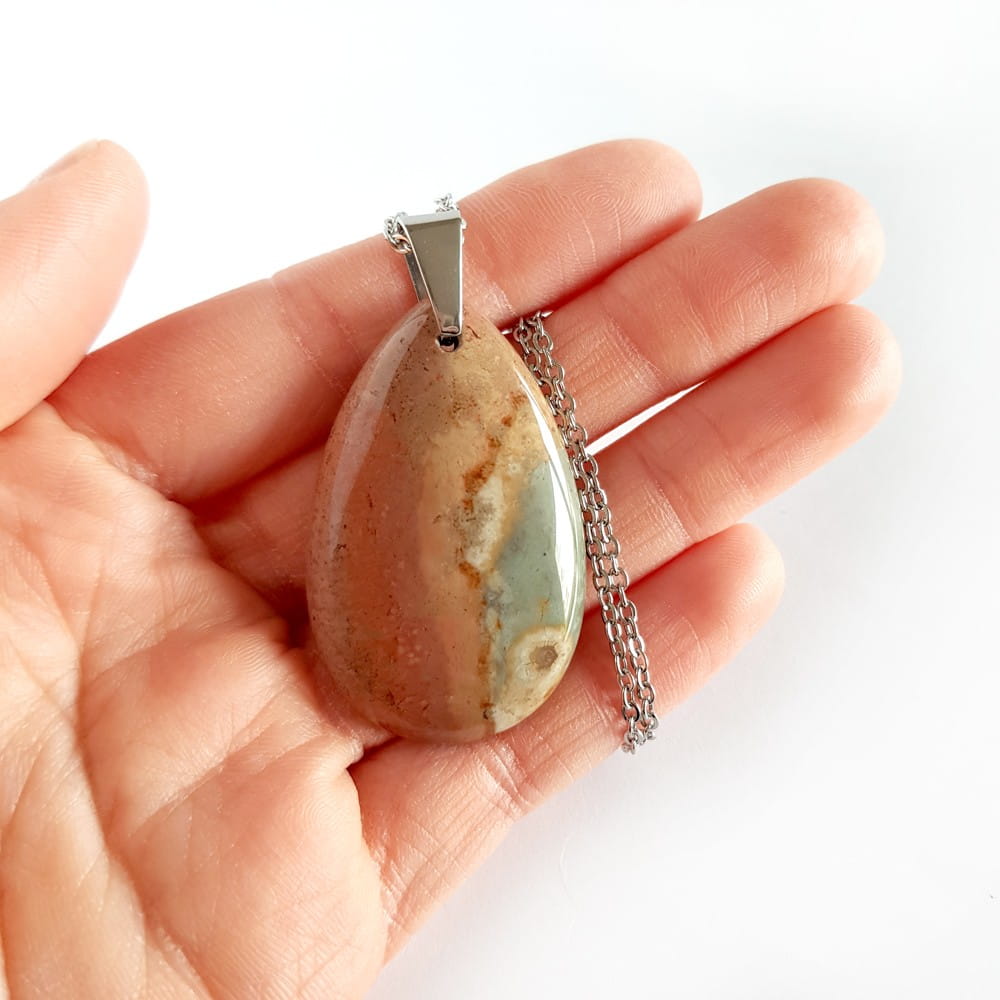 Naszyjnik wykonany z dużej kropli jaspisu polichromowego oraz łańcuszka ze stali chirurgicznej.
