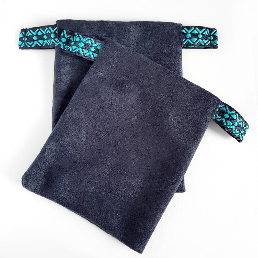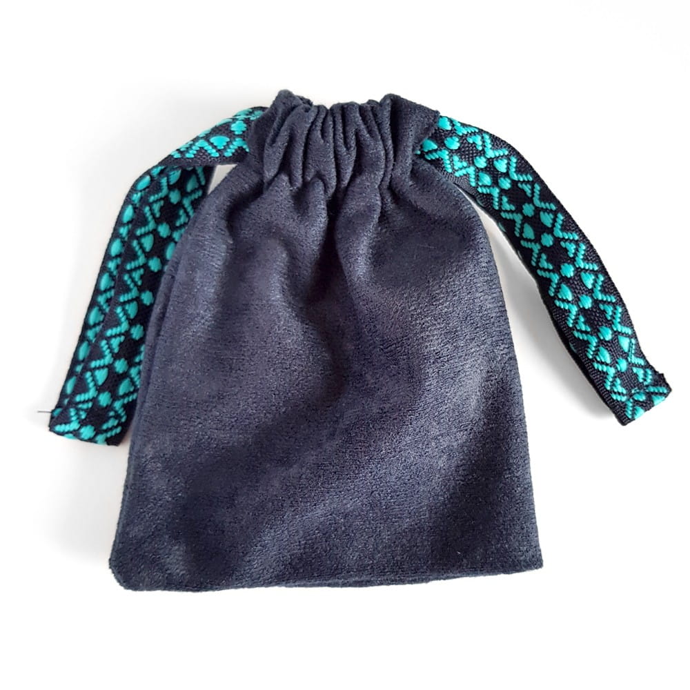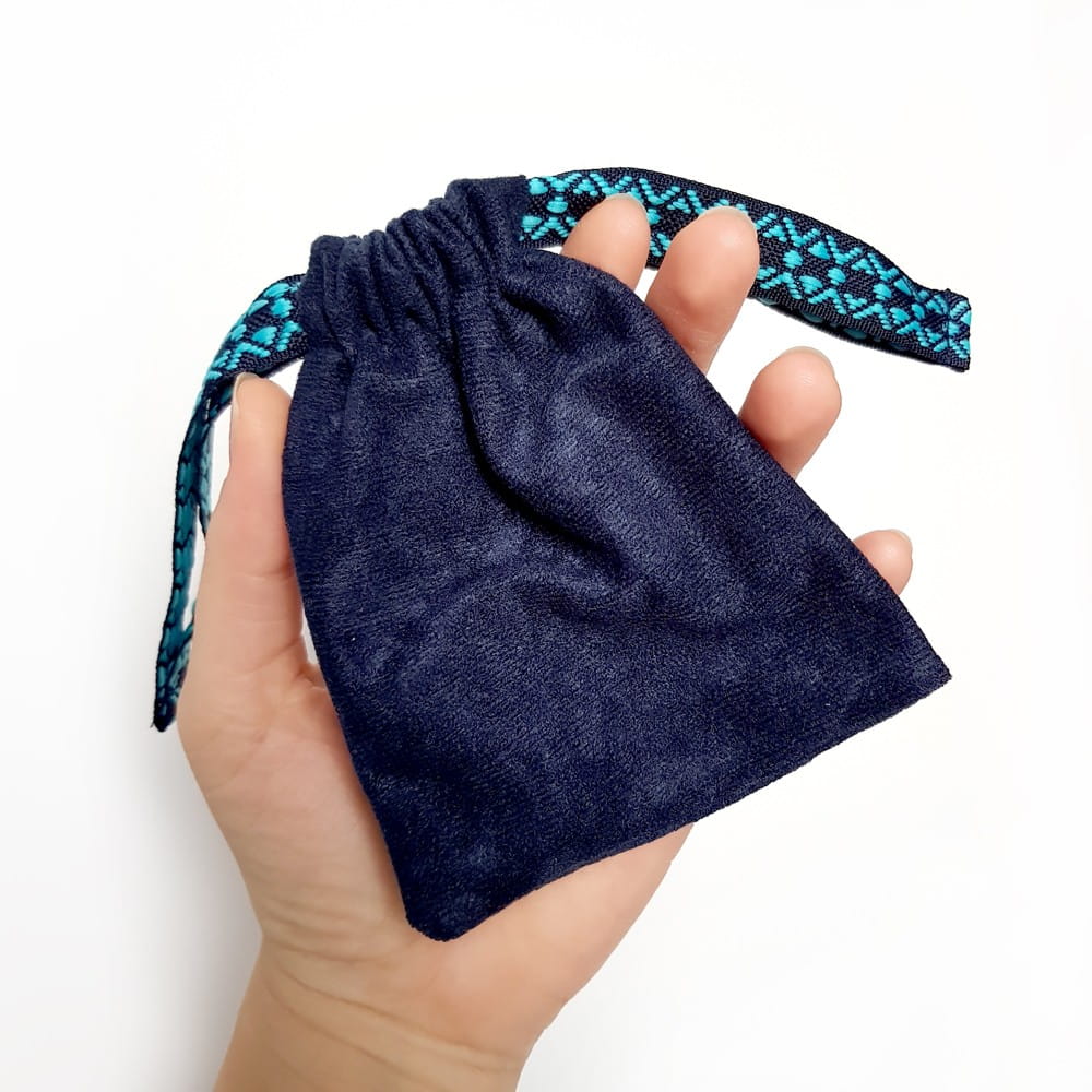 Granatowy woreczek, wykonany z miękkiej, pół-welurowej tkaniny i przepięknej, szerokiej taśmy, pomieści Twoje ulubione naszyjniki, kolczyki i bransoletki.