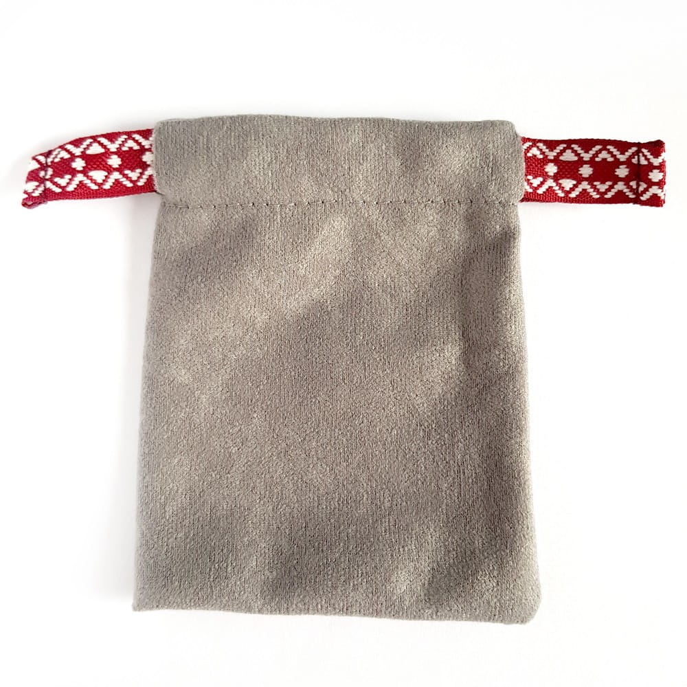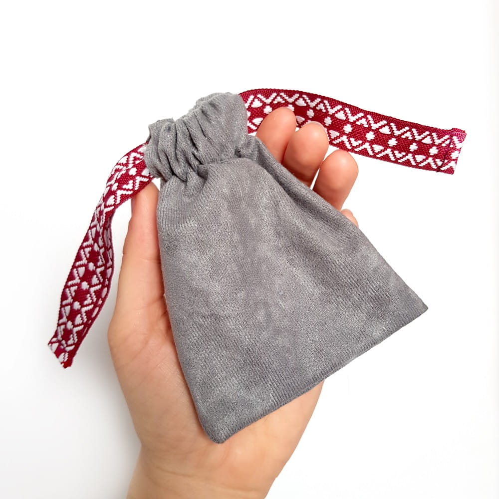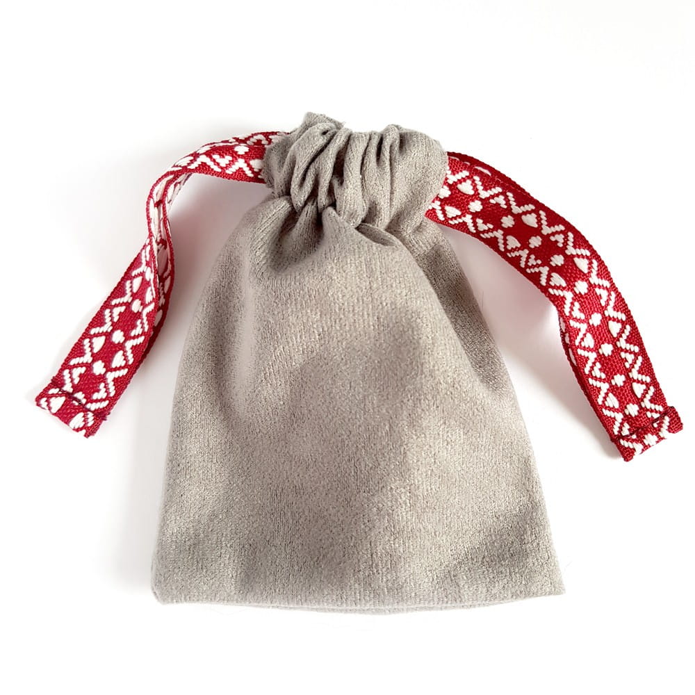 Szary woreczek, wykonany z miękkiej, pół-welurowej tkaniny i przepięknej, szerokiej taśmy, pomieści Twoje ulubione naszyjniki, kolczyki i bransoletki.