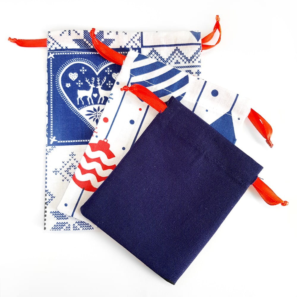 Zestaw woreczków we świąteczne wzory, pomieści drobne prezenty - naszyjniki, kolczyki i bransoletki.